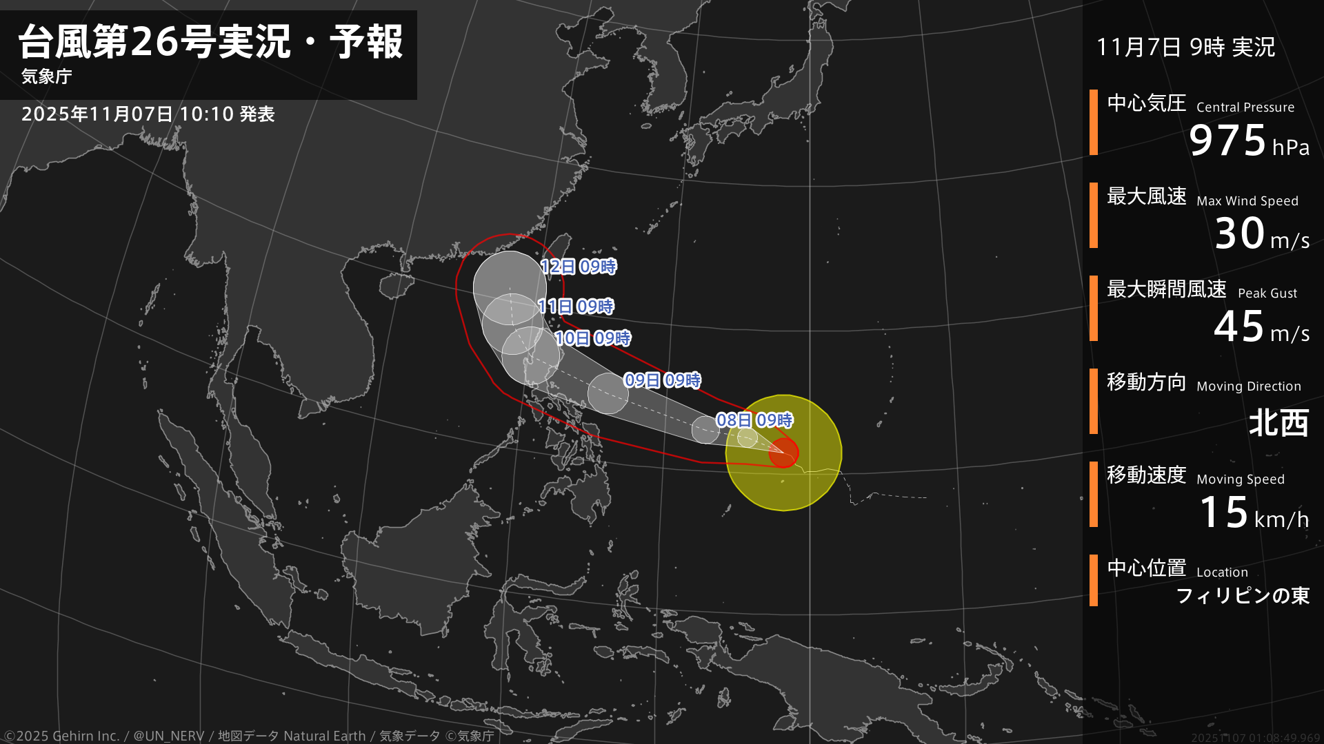 【台風第25号実況・予報 2025年11月04日 15:48】強い台風第25号(カルマエギ)は、フィリピンを1時間に20キロの速さで西南西に進んでいます。#台風情報