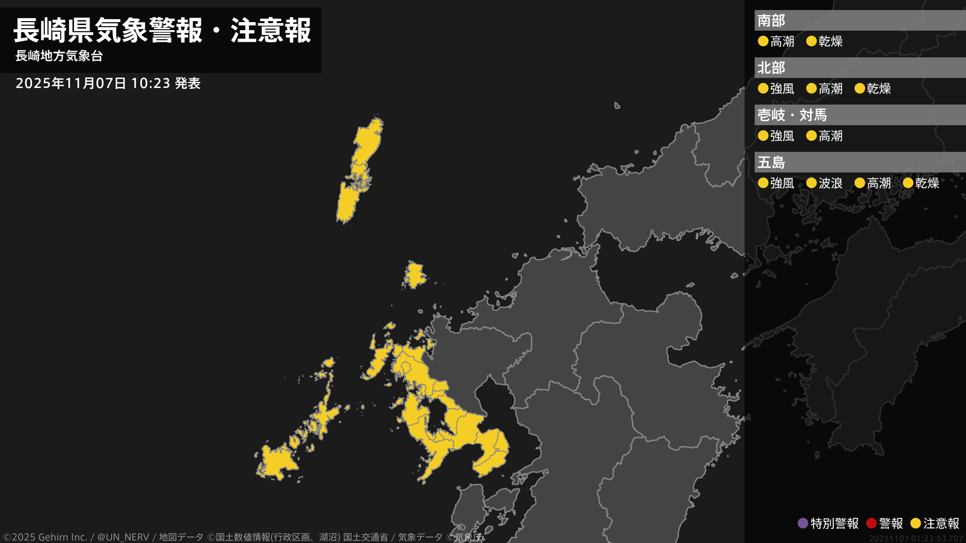 【長崎県 気象警報・注意報 2025年11月04日 16:37】南部、北部、壱岐・対馬では、ここしばらく高潮に注意してください。南部、北部、五島では、6日まで空気の乾燥した状態が続くため、火の取り扱いに注意してください。#気象警報注意報 #長崎県