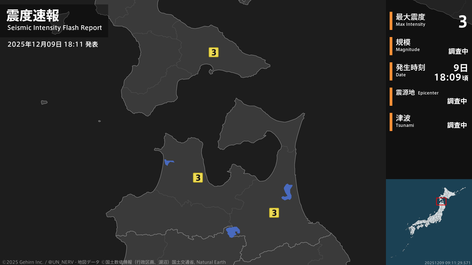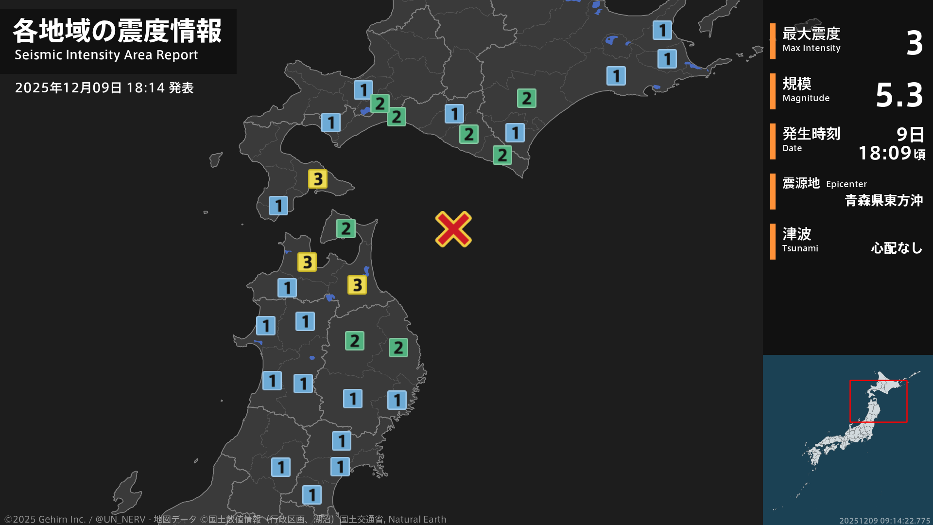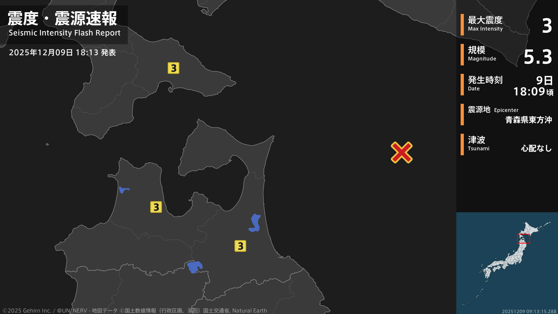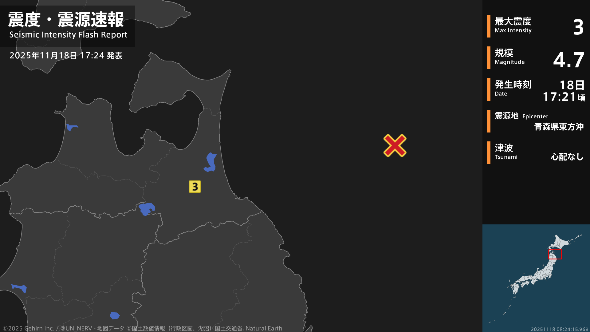 17時21分頃、青森県東方沖を震源とする地震がありました。地震の規模はM4.7程度、最大震度3程度と推定されています。この情報は気象庁の予報に基づく推定です。情報は誤差を含む場合があります。
