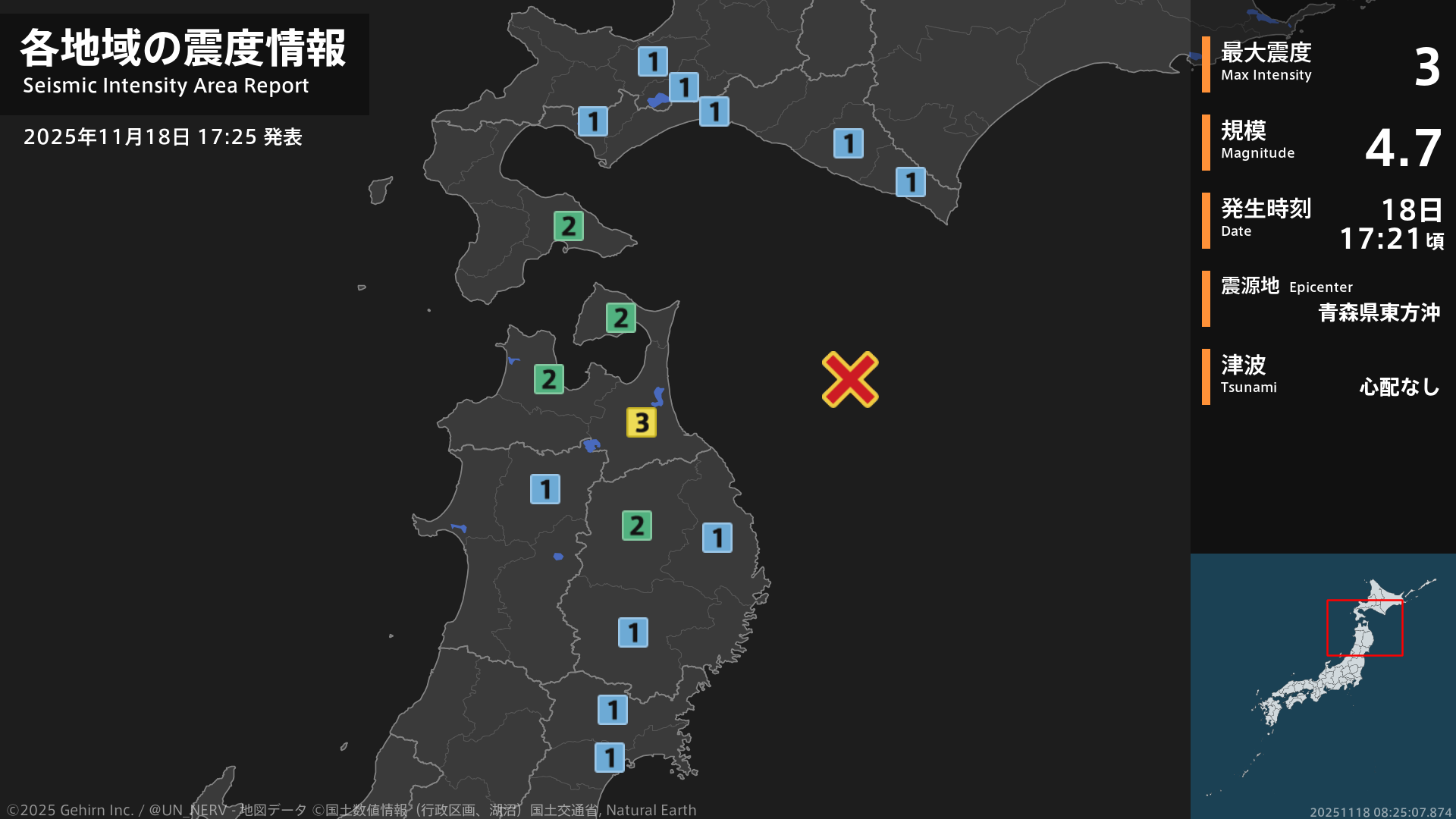 17時21分頃、青森県東方沖を震源とする地震がありました。震源の深さは約60km、地震の規模はM4.7程度、最大震度3程度と推定されています。詳しい情報が入り次第お伝えします。