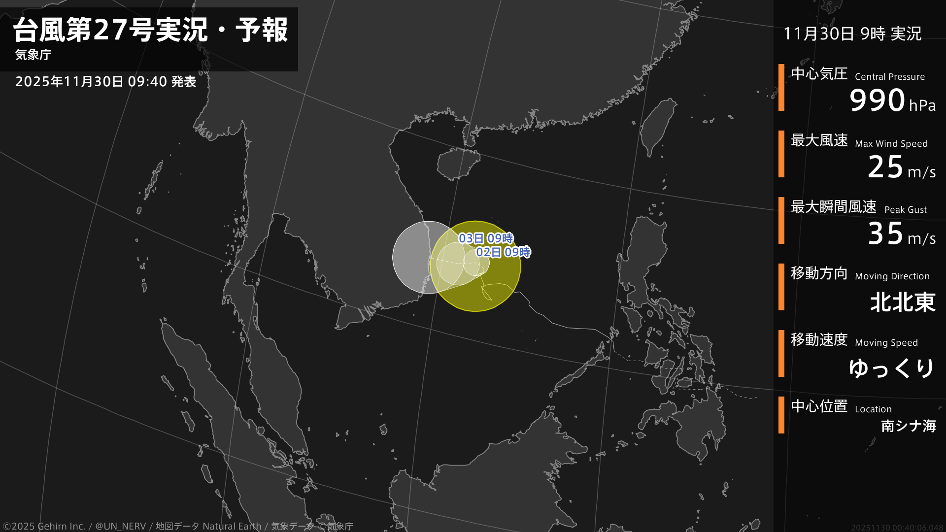 【台風第27号実況・予報 2025年11月30日 09:40】台風第27号(コト)は、南シナ海をゆっくりと北北東に進んでいます。#台風情報