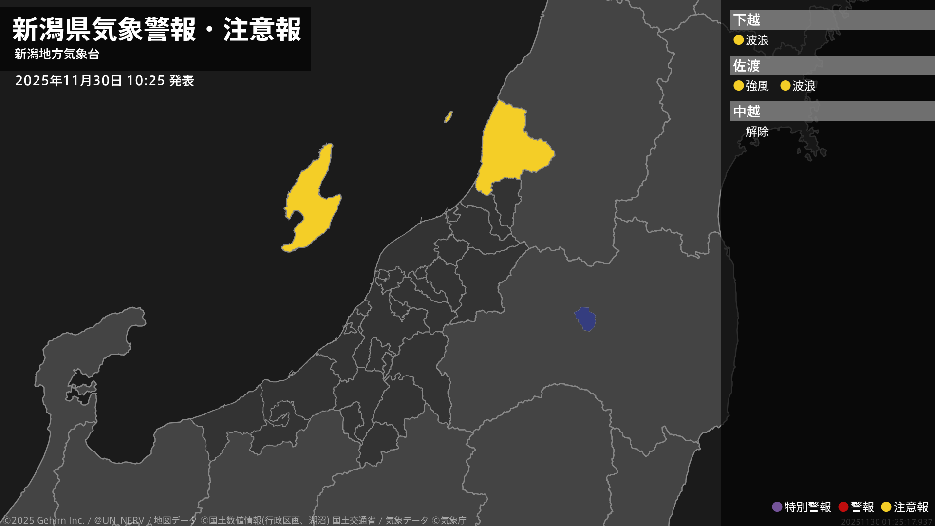 【新潟県 気象警報・注意報 2025年11月30日 10:25】佐渡では、30日昼過ぎまで強風に注意してください。下越、佐渡では、30日夕方まで高波に注意してください。#気象警報注意報 #新潟県