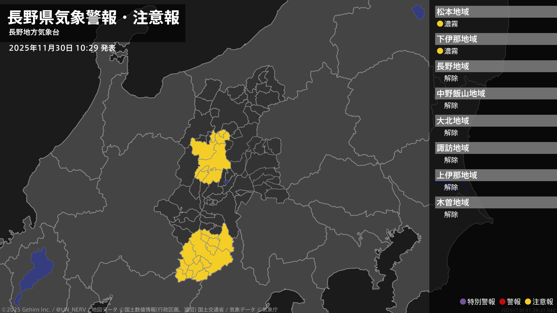 【長野県 気象警報・注意報 2025年11月30日 10:29】中部、南部では、30日昼前まで濃霧による視程障害に注意してください。#気象警報注意報 #長野県