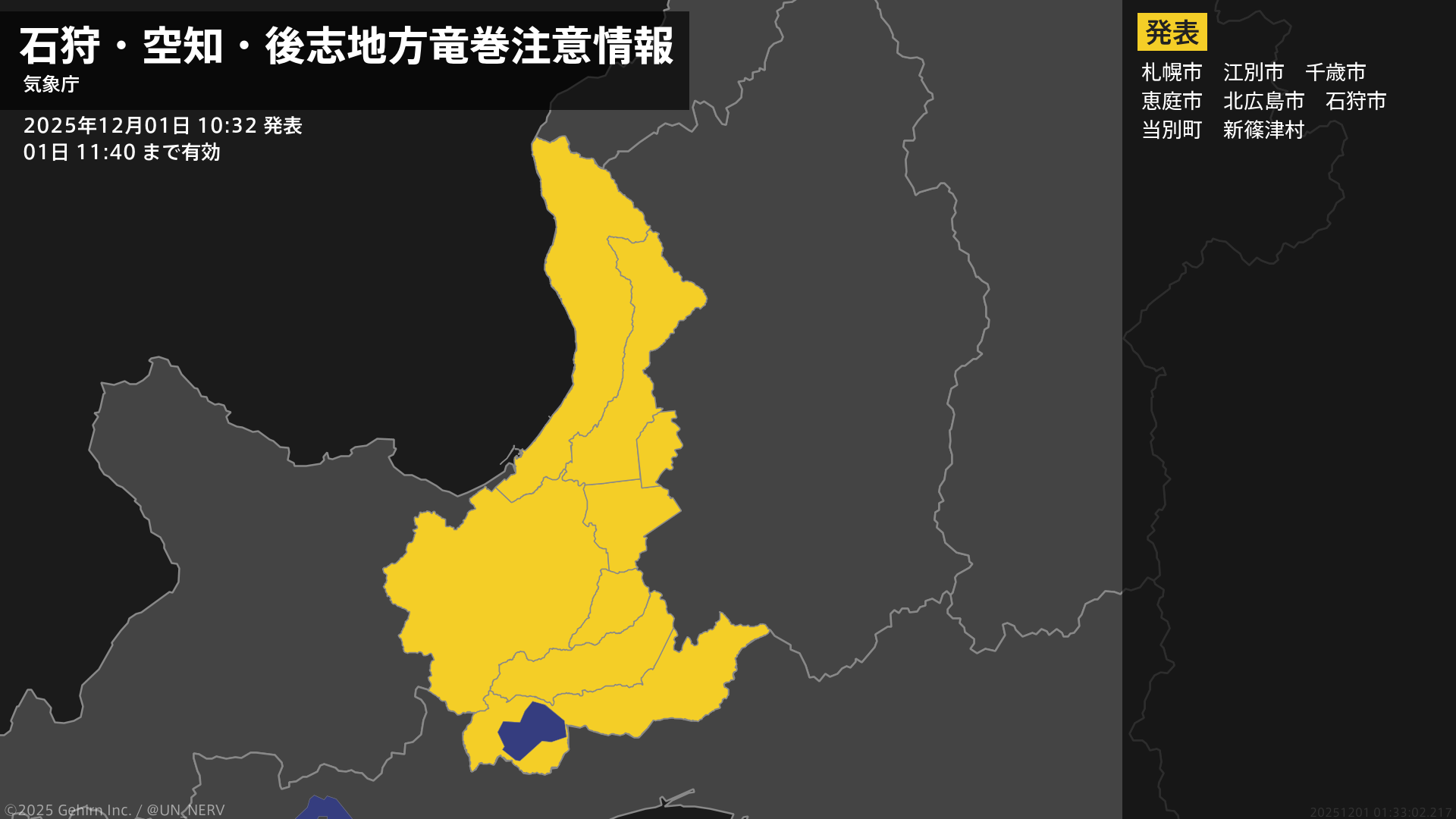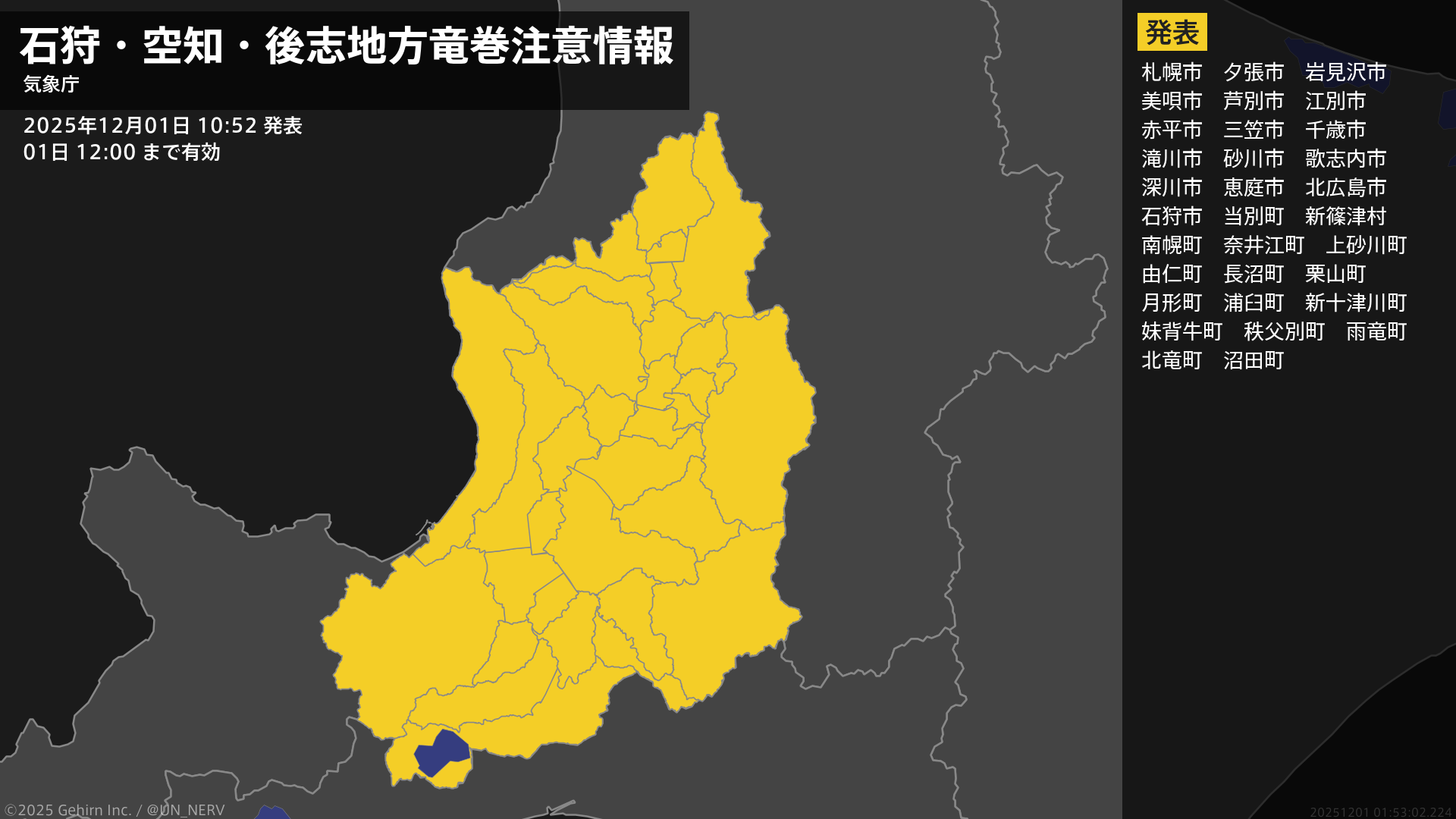 【石狩・空知・後志地方 気象警報・注意報 2025年11月30日 10:14】石狩、空知、後志地方では、30日夕方まで竜巻などの激しい突風や急な強い雨、落雷に注意してください。#気象警報注意報 #石狩地方 #空知地方 #後志地方