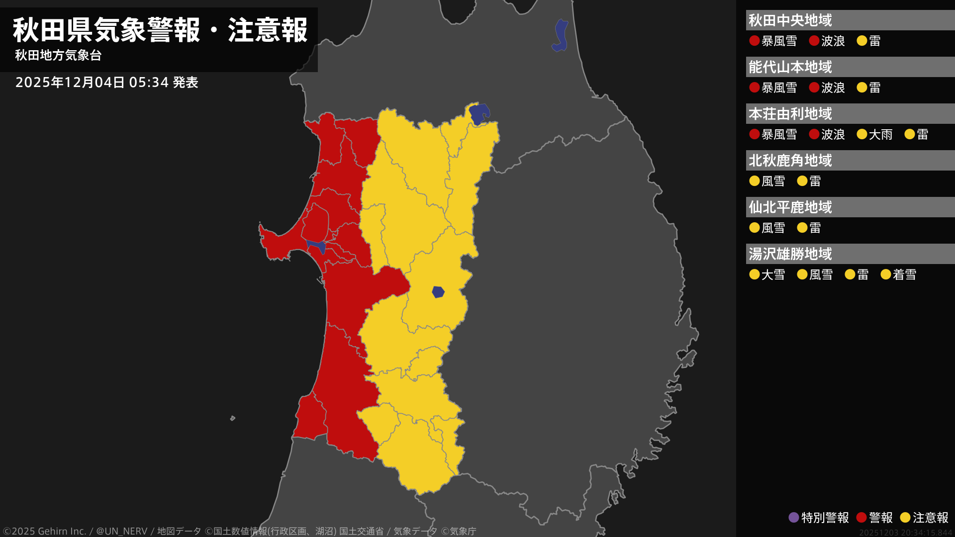 【秋田県 気象警報・注意報 2025年12月04日 11:23】