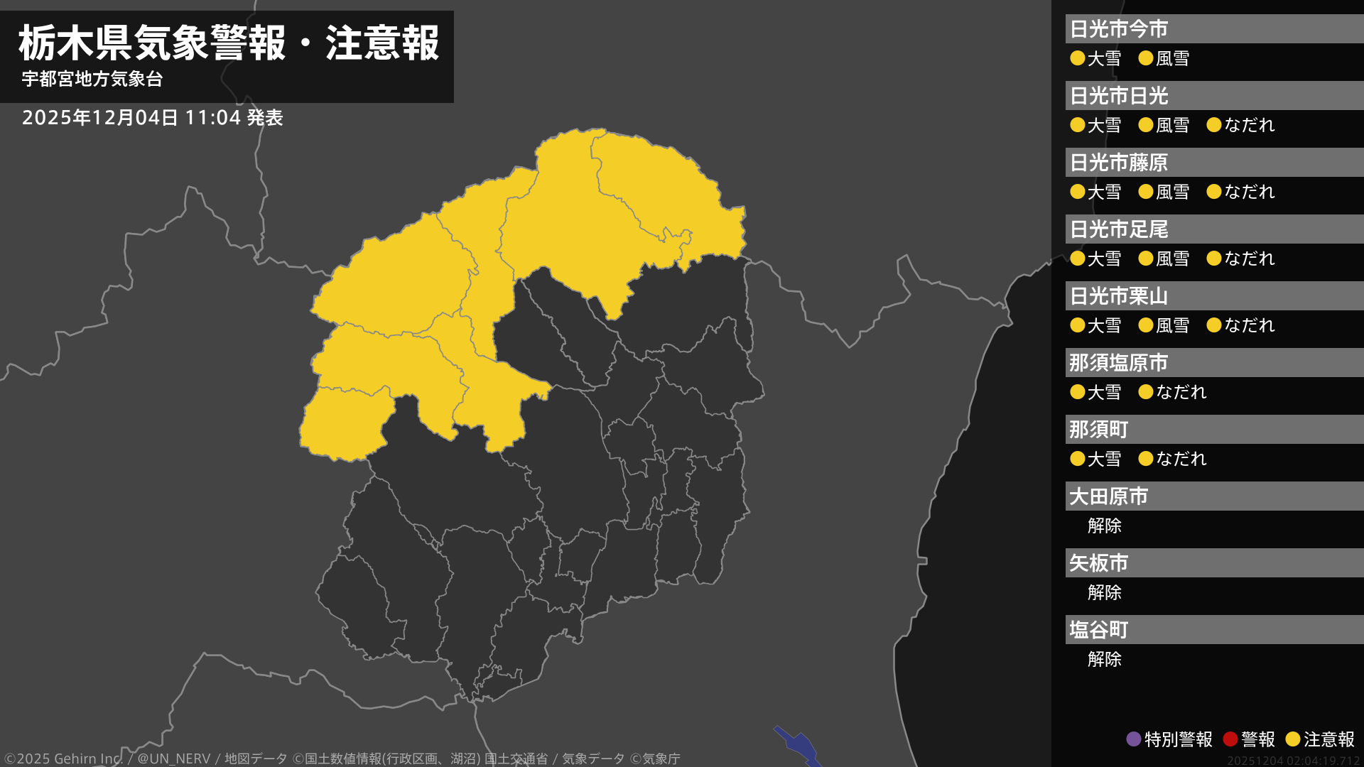 【栃木県 気象警報・注意報 2025年12月04日 11:04】