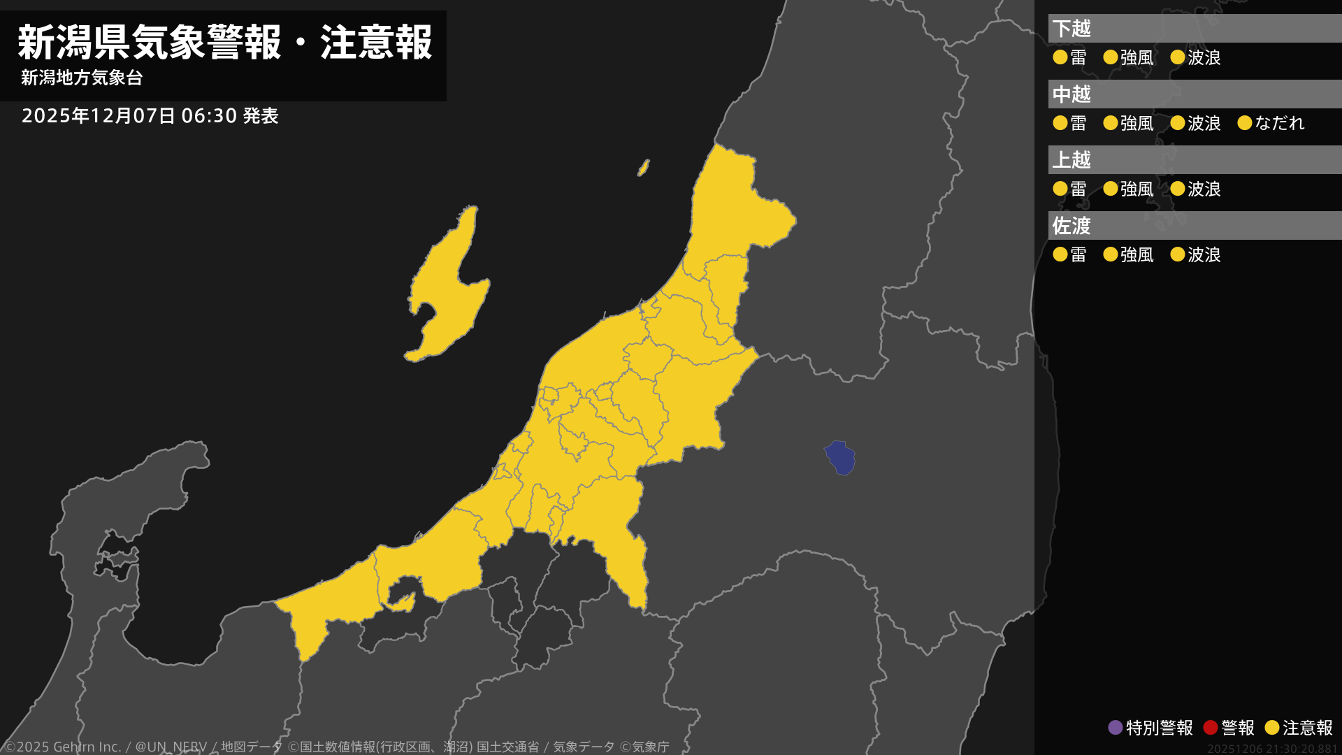 【新潟県 気象警報・注意報 2025年12月06日 07:22】中越では、6日までなだれに注意してください。#気象警報注意報 #新潟県