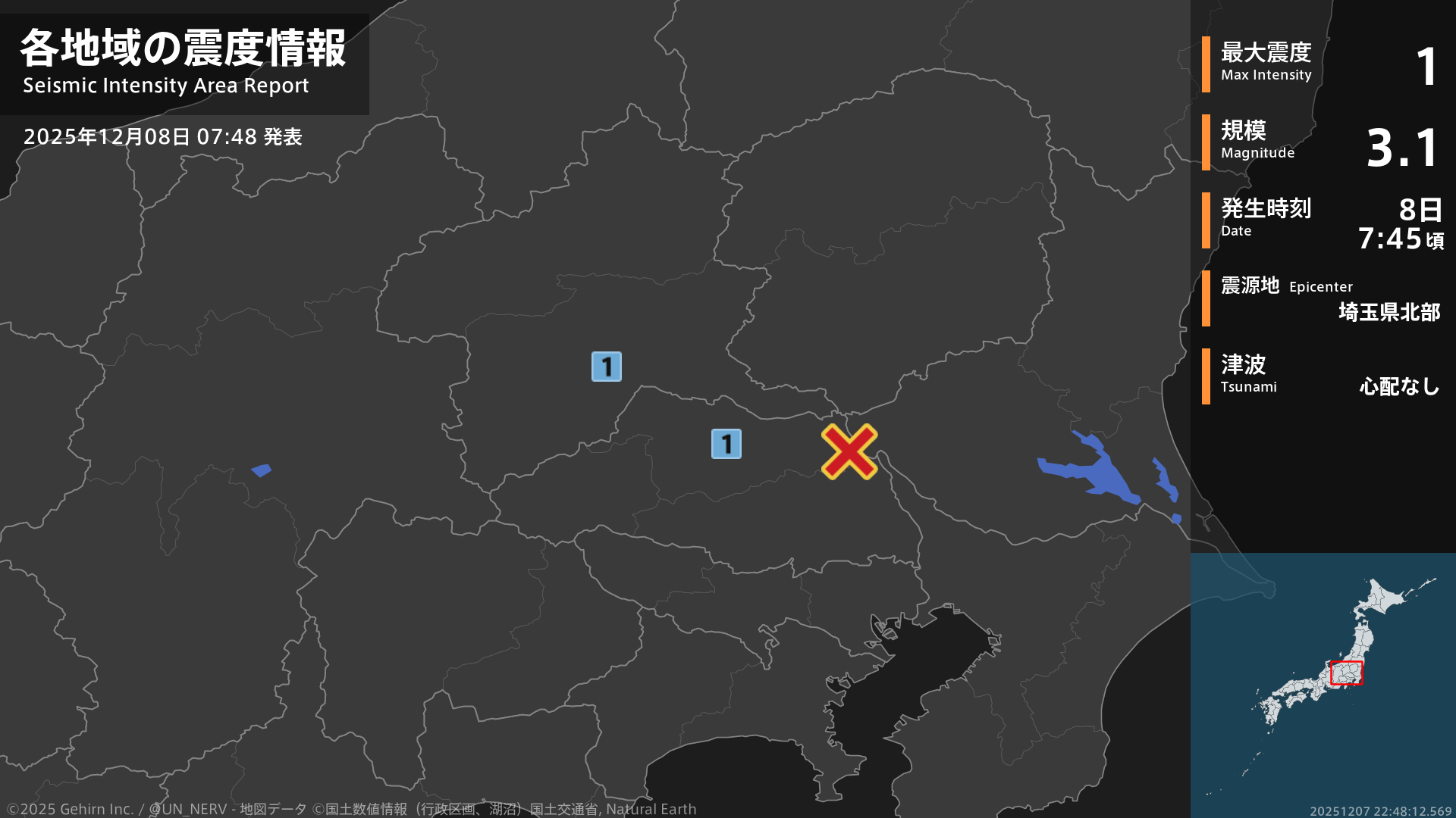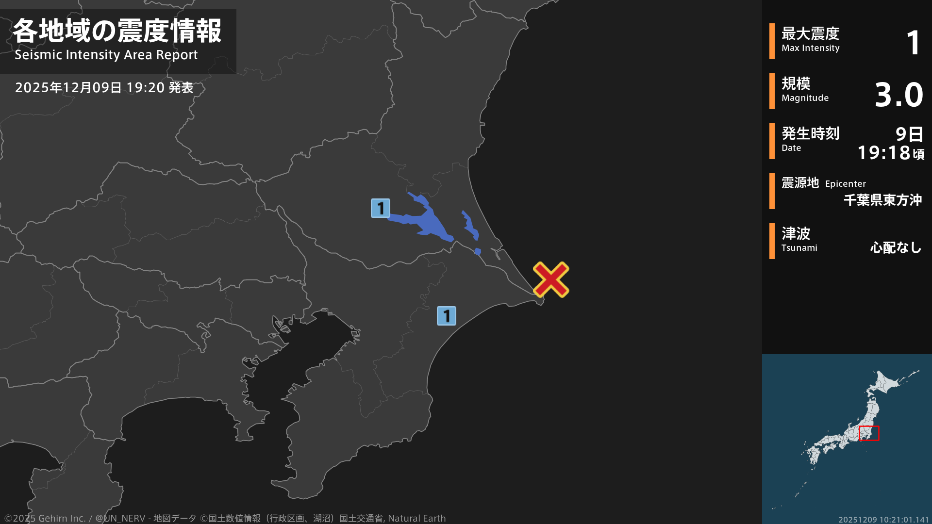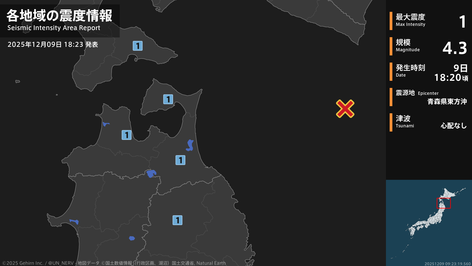 17時21分頃、青森県東方沖を震源とする地震がありました。地震の規模はM4.5程度、最大震度2程度と推定されています。この情報は気象庁の予報に基づく推定です。情報は誤差を含む場合があります。