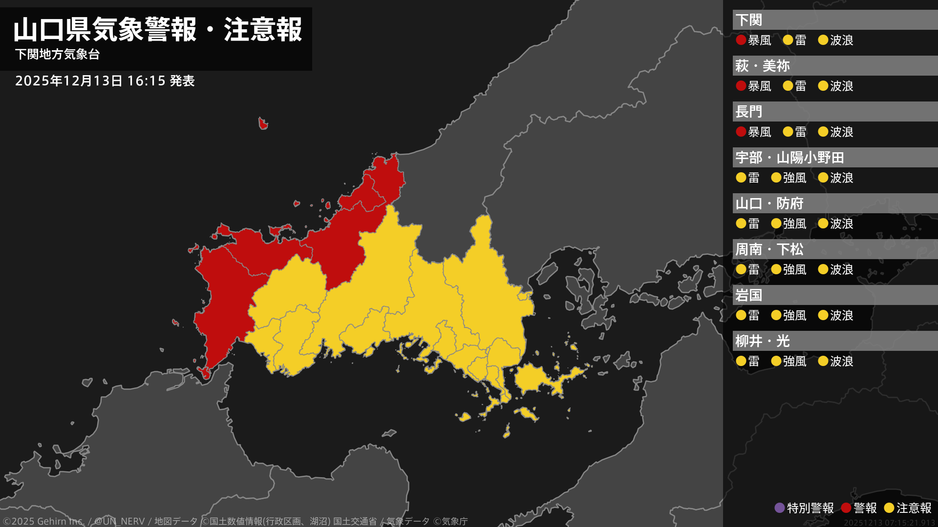 【山形県 気象情報 2025年12月14日 06:44】庄内では、急速に発達する低気圧の影響により、14日夕方から15日昼前にかけて、海上を中心に西よりの非常に強い風が吹き、大しけとなるでしょう。暴風や高波に警戒してください。また、山形県では、14日夕方から15日昼前にかけて、大気の非常に不安定な状態が続くため、竜巻などの激しい突風や落雷、ひょうに注意してください。#気象情報 #山形県