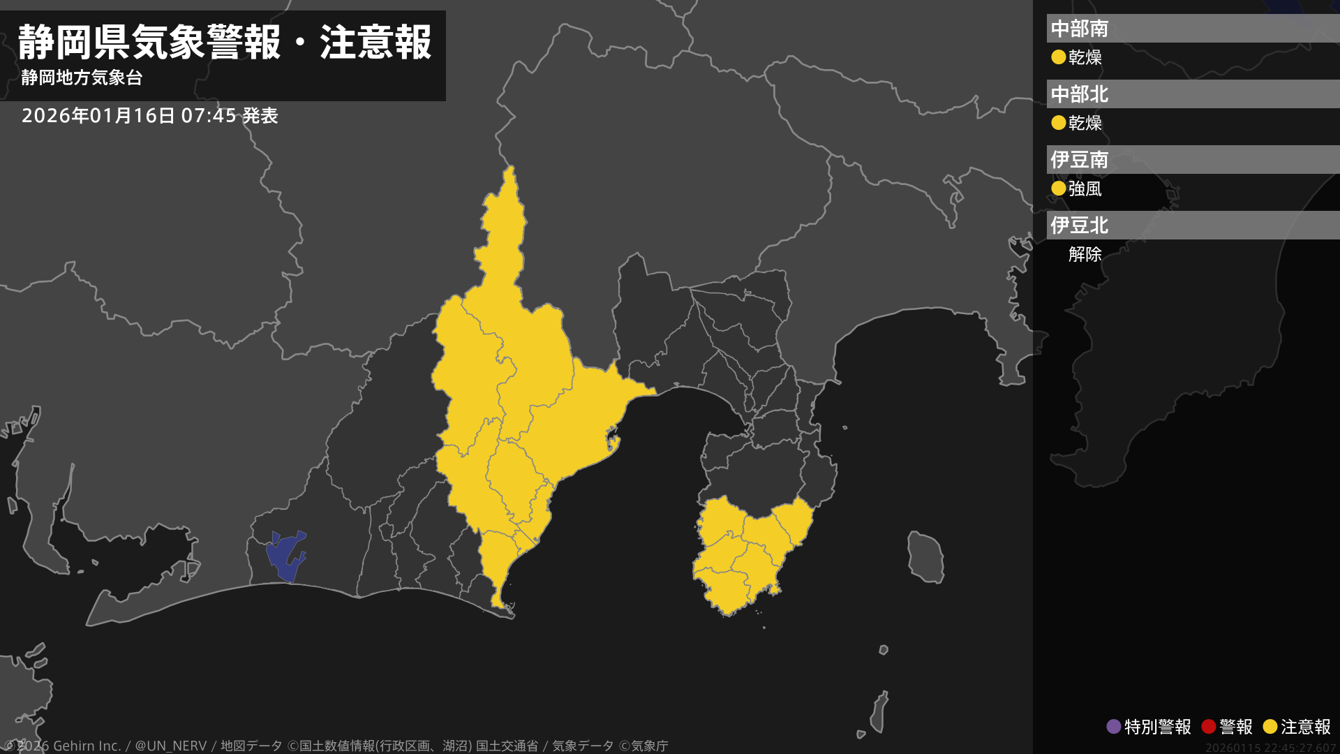【静岡県 気象警報・注意報 2026年01月16日 07:45】伊豆では、16日昼過ぎまで強風に注意してください。中部では、17日まで空気の乾燥した状態が続くため、火の取り扱いに注意してください。#気象警報注意報 #静岡県