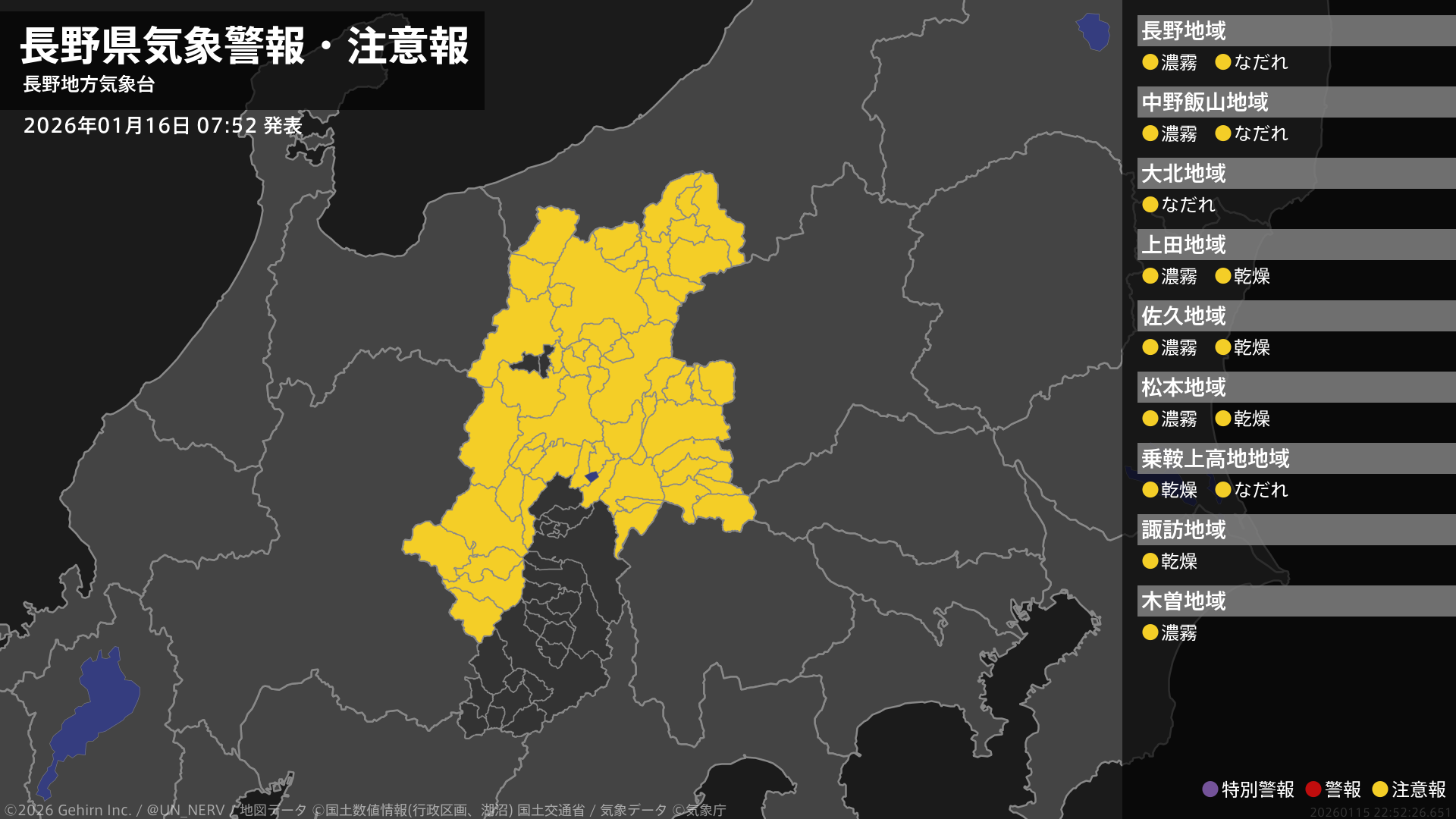 【長野県 気象警報・注意報 2026年01月16日 07:39】長野県では、濃霧による視程障害に注意してください。中部では、空気の乾燥した状態が続くため、火の取り扱いに注意してください。北部、中部では、なだれに注意してください。#気象警報注意報 #長野県