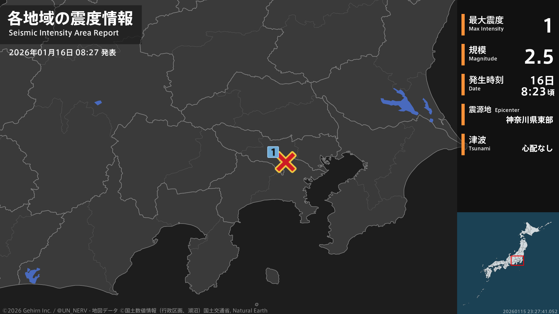 【地震情報 2026年1月16日】8時23分頃、神奈川県東部を震源とする地震がありました。震源の深さは約30km、地震の規模はM2.5、最大震度1を東京都で観測しています。この地震による津波の心配はありません。#地震 #東京都