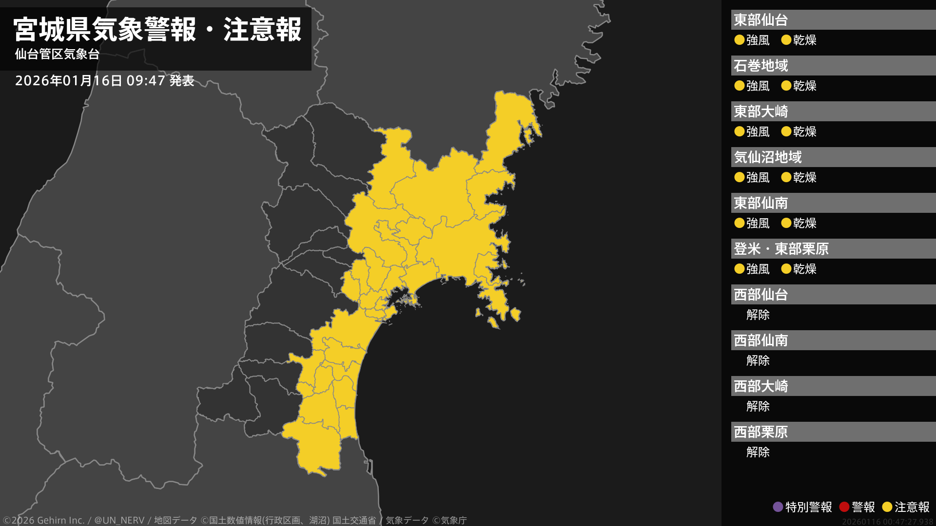 【宮城県 気象警報・注意報 2026年01月16日 09:47】東部では、16日夜遅くまで強風に、17日まで空気の乾燥した状態が続くため、火の取り扱いに注意してください。#気象警報注意報 #宮城県
