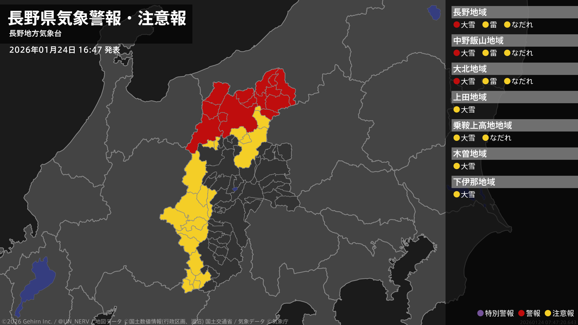 【長野県 気象警報・注意報 2026年01月24日 16:47】