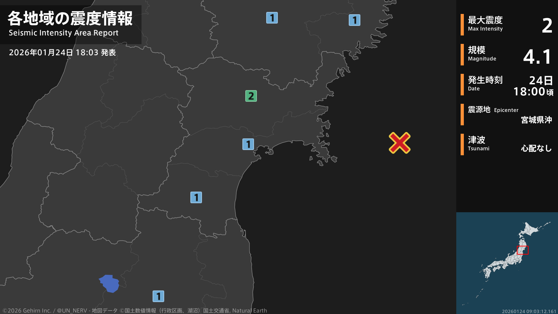 18時0分頃、宮城県沖を震源とする地震がありました。震源の深さは約90km、地震の規模はM4.1、最大震度2を宮城県で観測しています。この地震による津波の心配はありません。