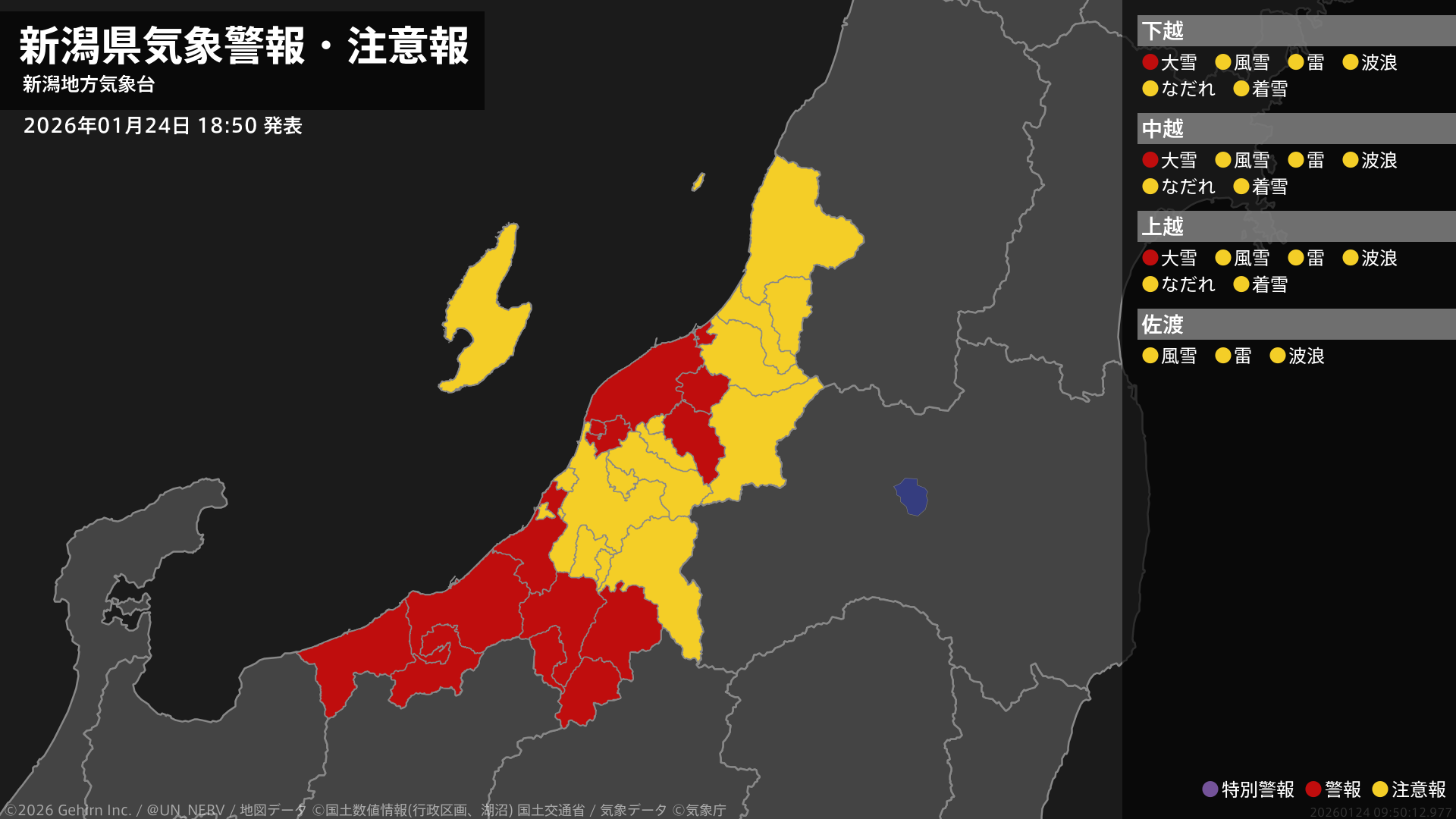 【新潟県 気象警報・注意報 2026年01月24日 18:50】