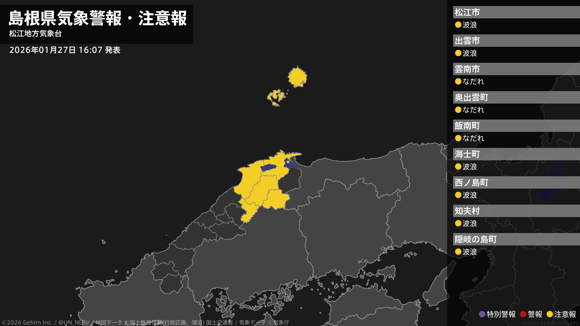 【島根県 気象警報・注意報 2026年01月27日 16:07】東部、隠岐では、28日昼前まで高波に注意してください。東部では、27日までなだれに注意してください。#気象警報注意報 #島根県