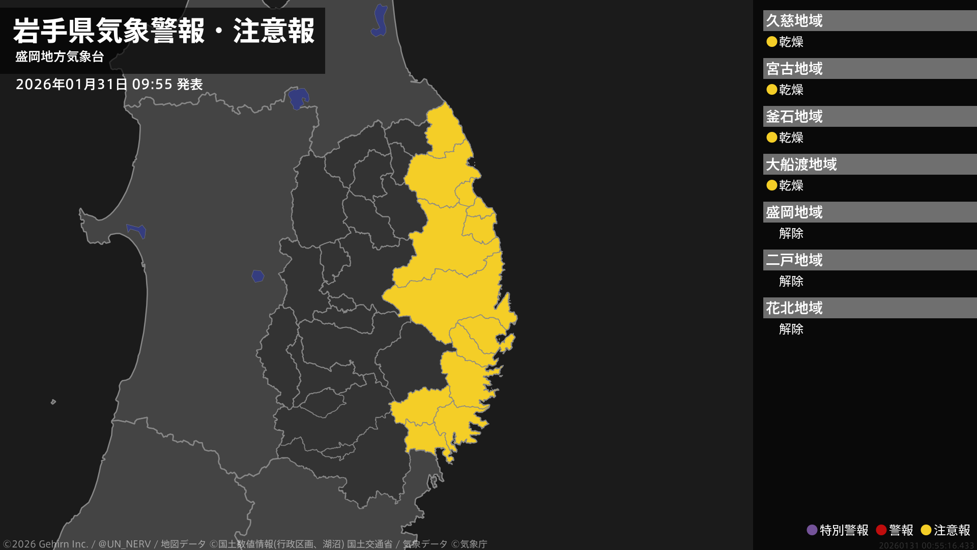 【岩手県 気象警報・注意報 2026年01月31日 09:55】沿岸南部では31日まで、沿岸北部では1日まで、空気の乾燥した状態が続くため、火の取り扱いに注意してください。#気象警報注意報 #岩手県