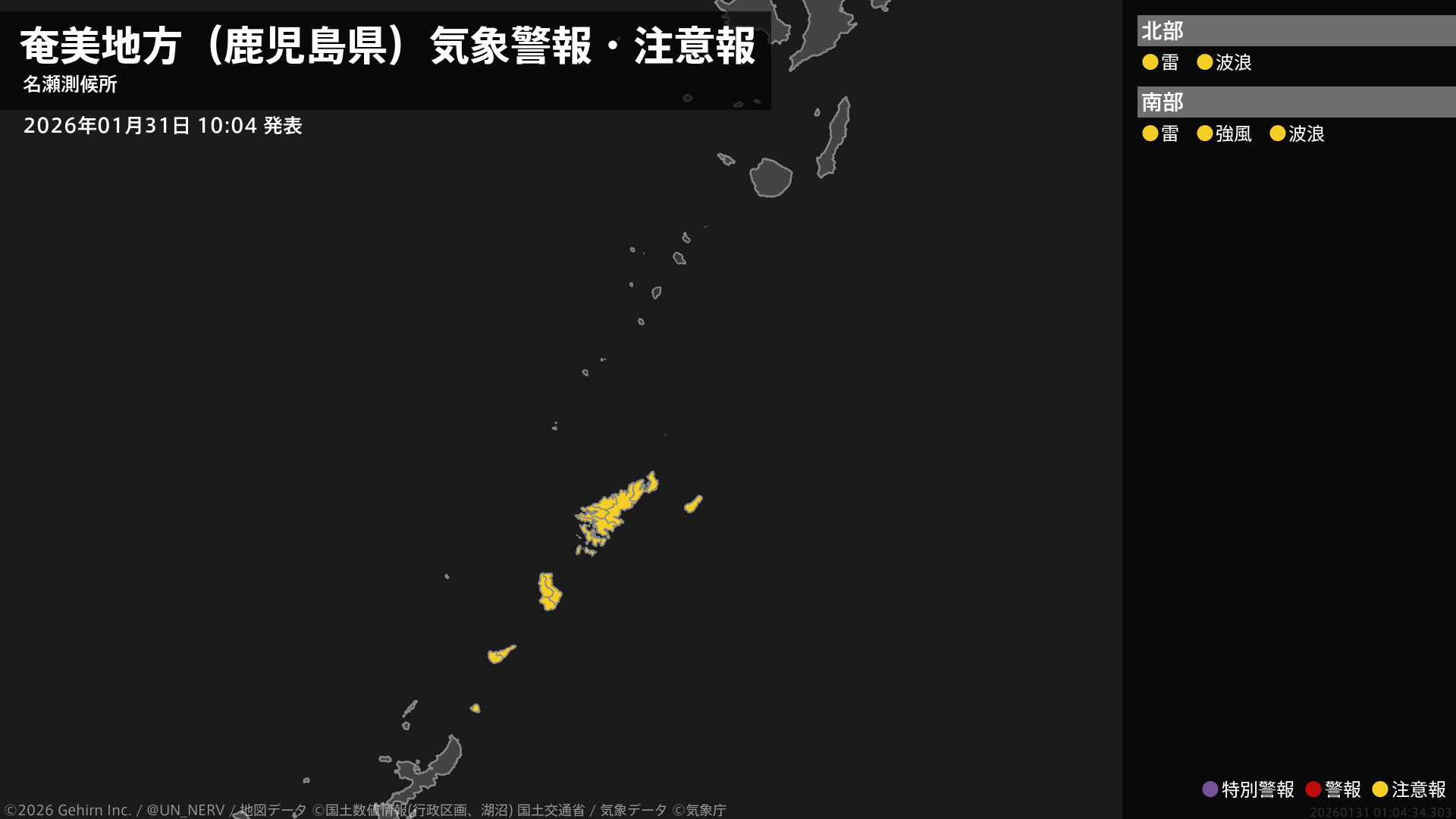 【奄美地方(鹿児島県) 気象警報・注意報 2026年01月31日 10:04】奄美地方では、31日昼過ぎから31日夜のはじめ頃まで強風に、31日夕方から31日夜遅くまで高波に、31日夜のはじめ頃まで急な強い雨や落雷に注意してください。#気象警報注意報 #奄美地方