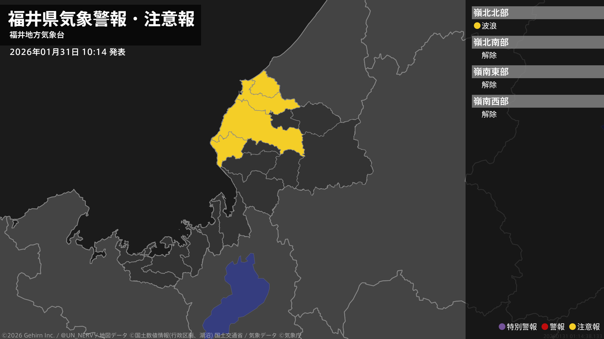 【福井県 気象警報・注意報 2026年01月31日 10:14】嶺北では、31日夕方まで高波に注意してください。#気象警報注意報 #福井県
