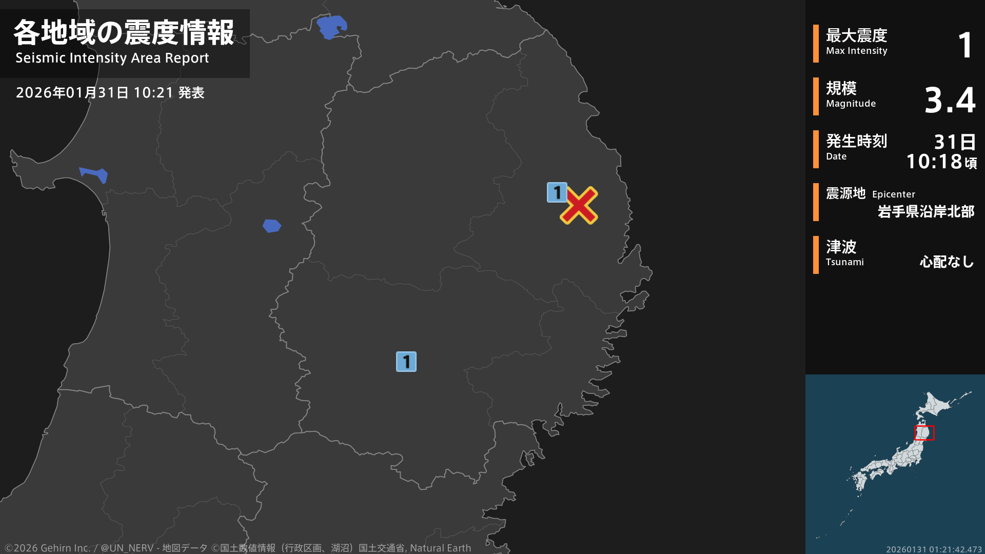【地震情報 2026年1月31日】10時18分頃、岩手県沿岸北部を震源とする地震がありました。震源の深さは約60km、地震の規模はM3.4、最大震度1を岩手県で観測しています。この地震による津波の心配はありません。#地震 #岩手県