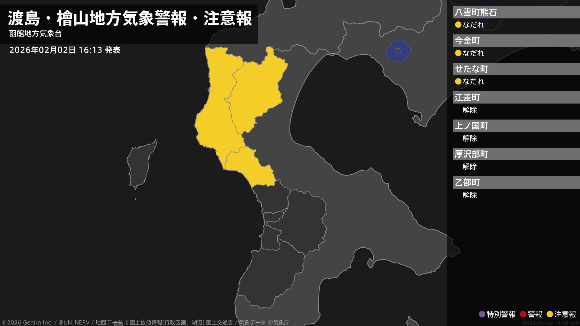 【渡島・檜山地方 気象警報・注意報 2026年02月02日 16:13】