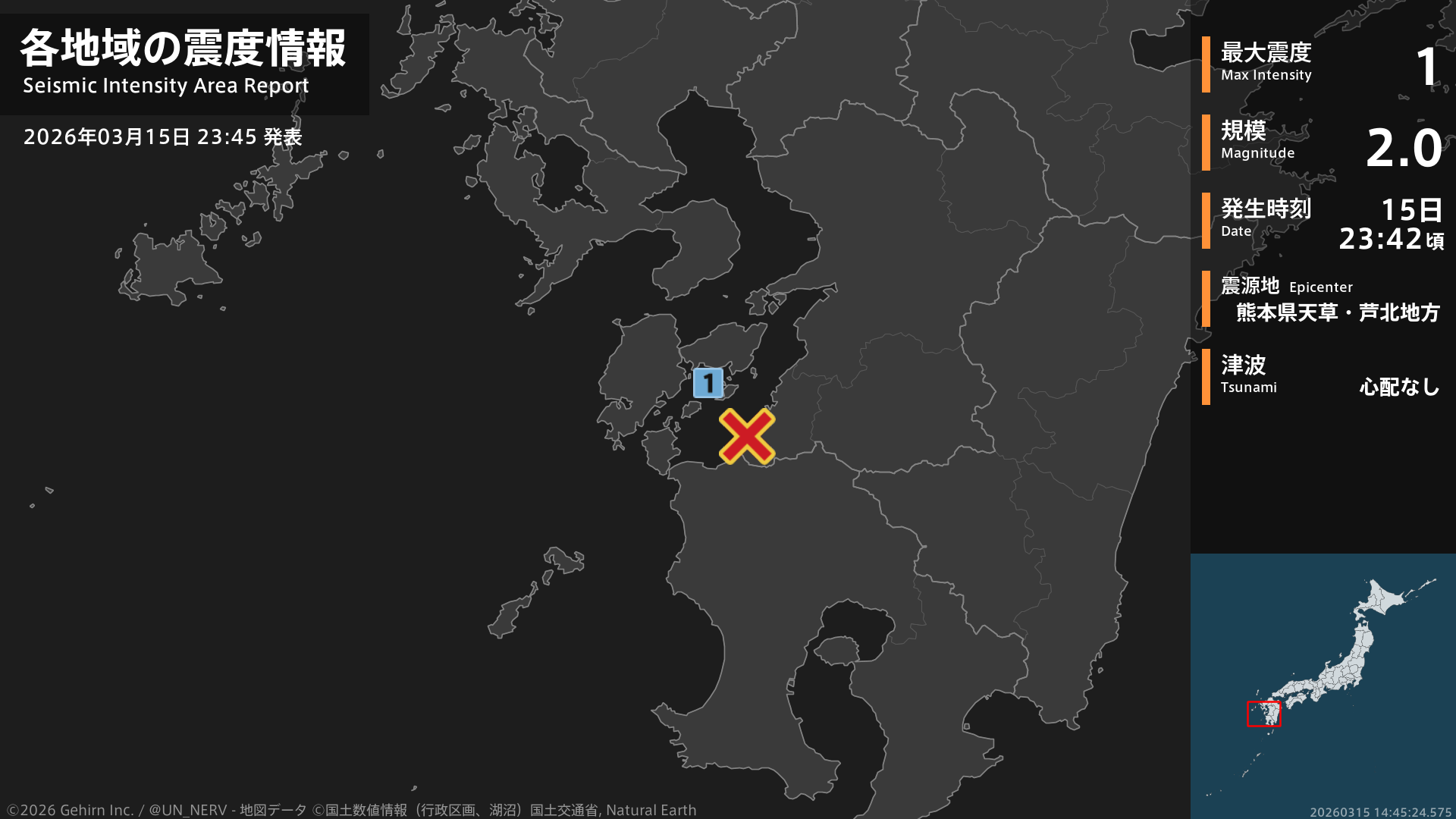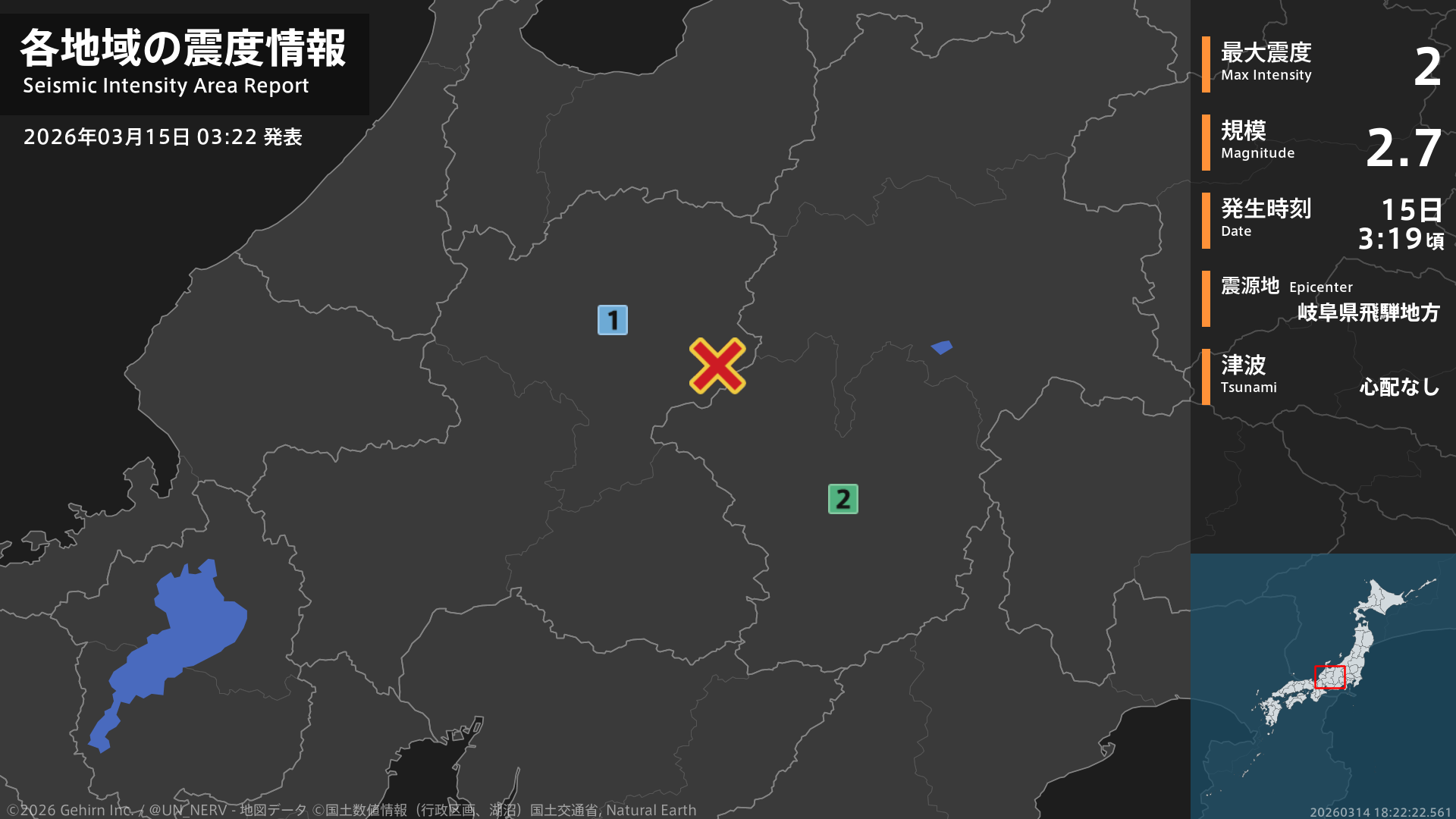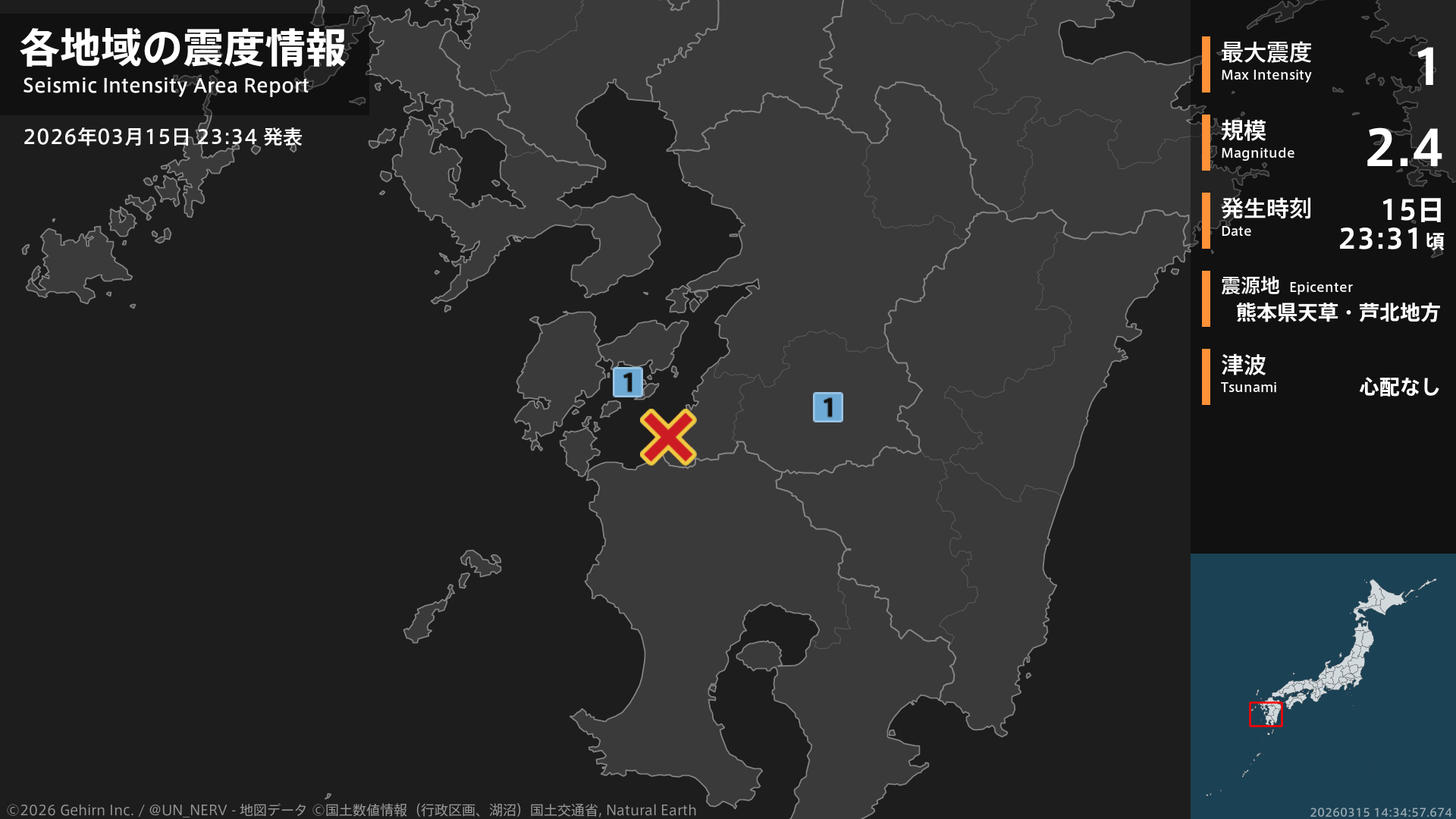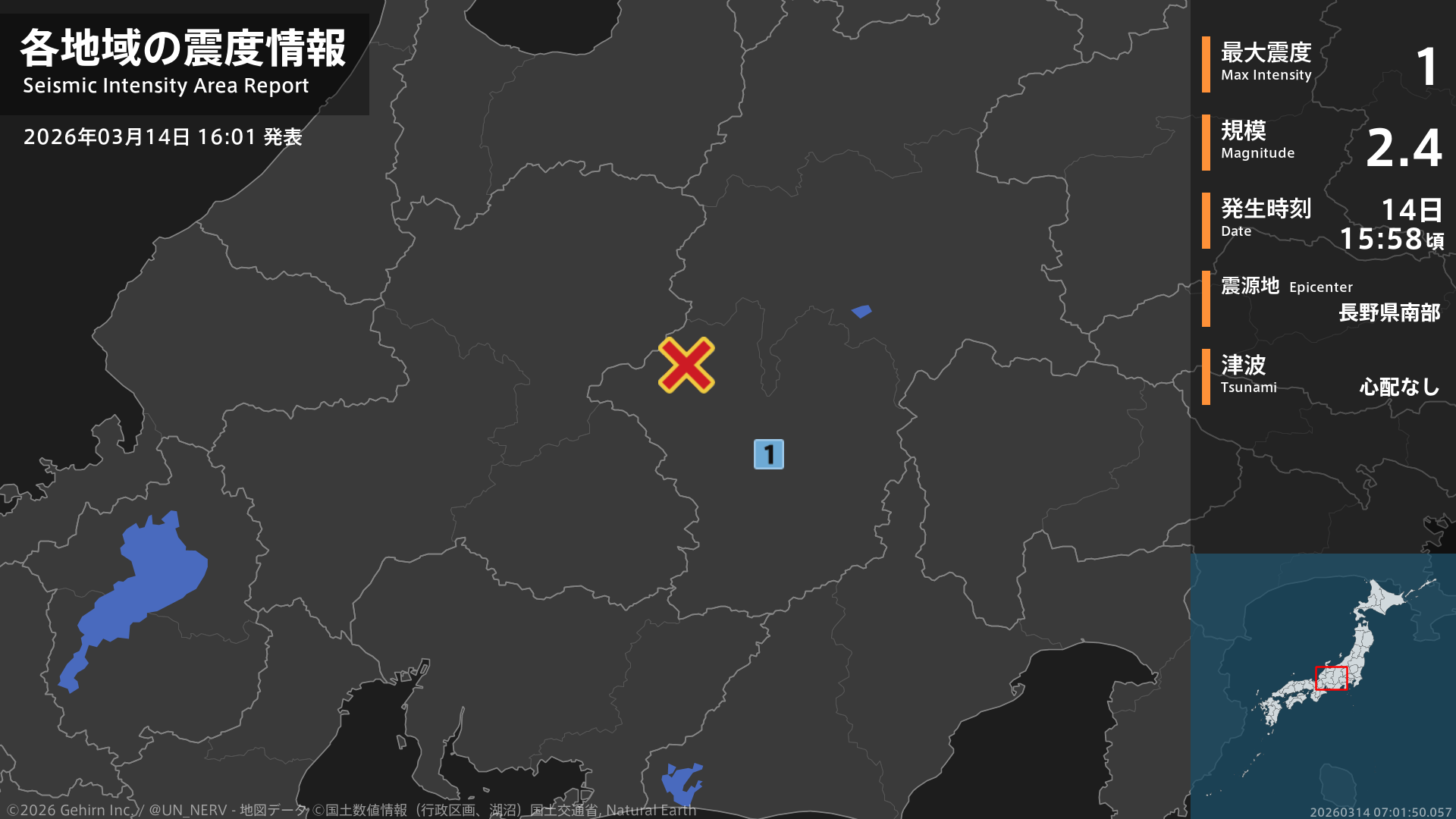 15時58分頃、長野県南部を震源とする地震がありました。震源の深さは約10km、地震の規模はM2.4、最大震度1を長野県で観測しています。この地震による津波の心配はありません。