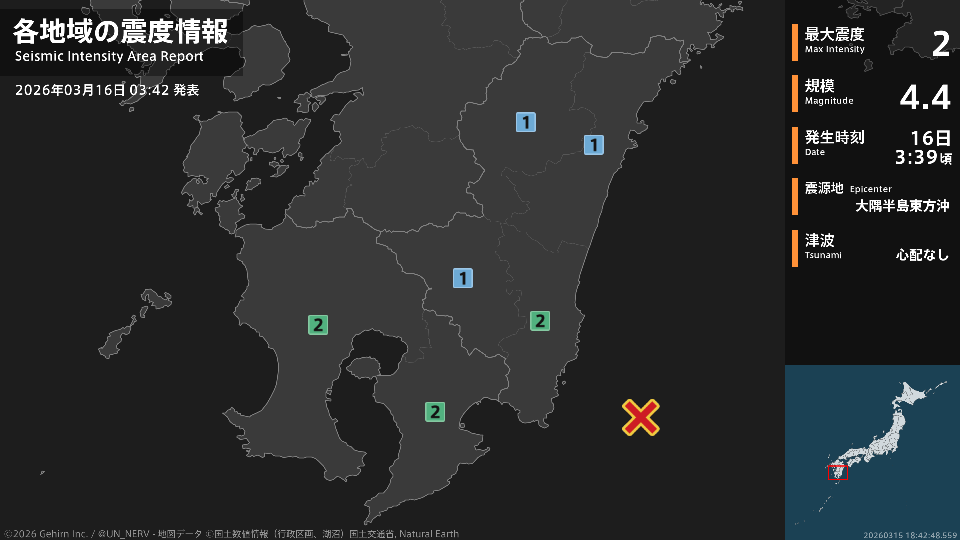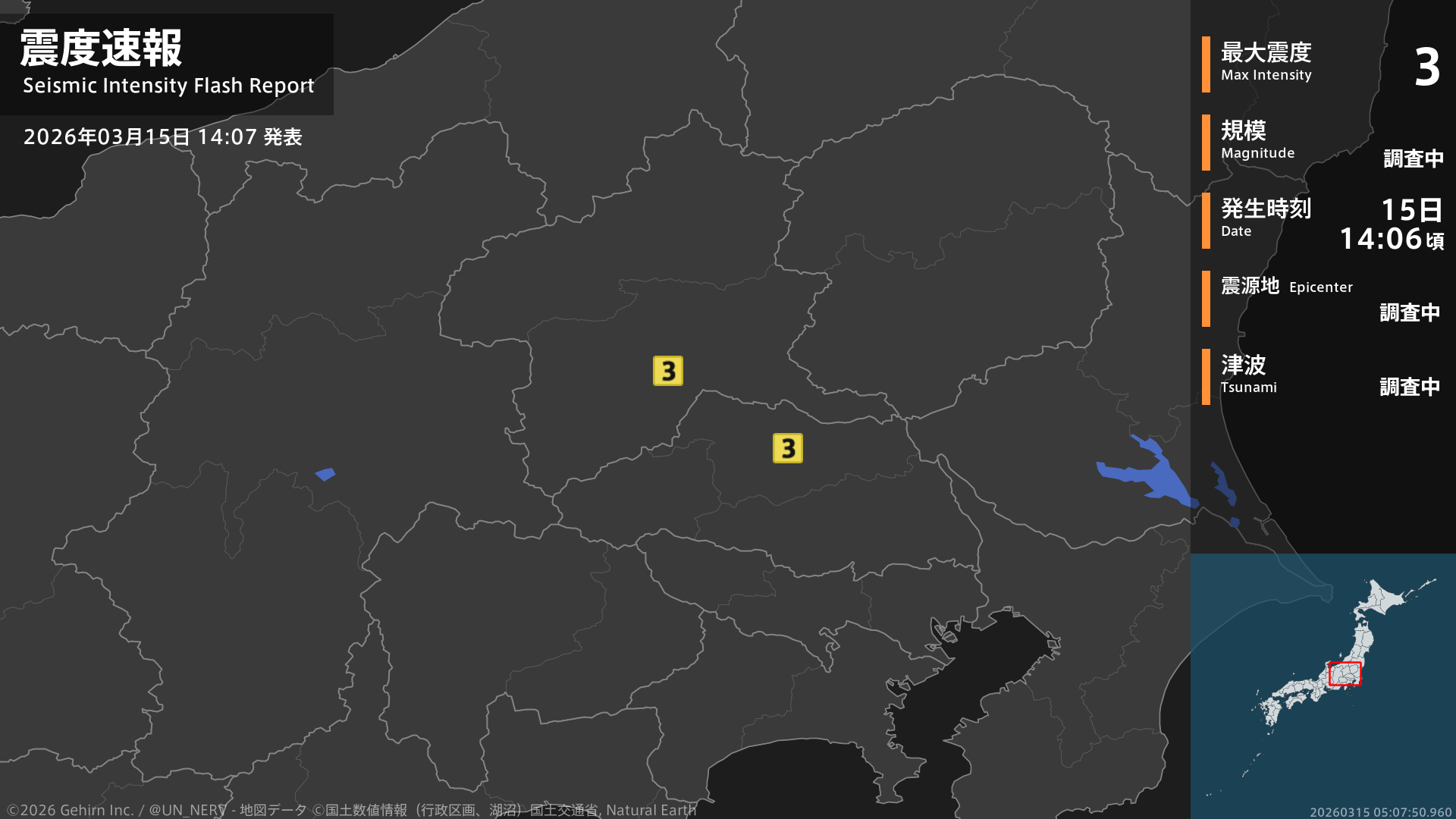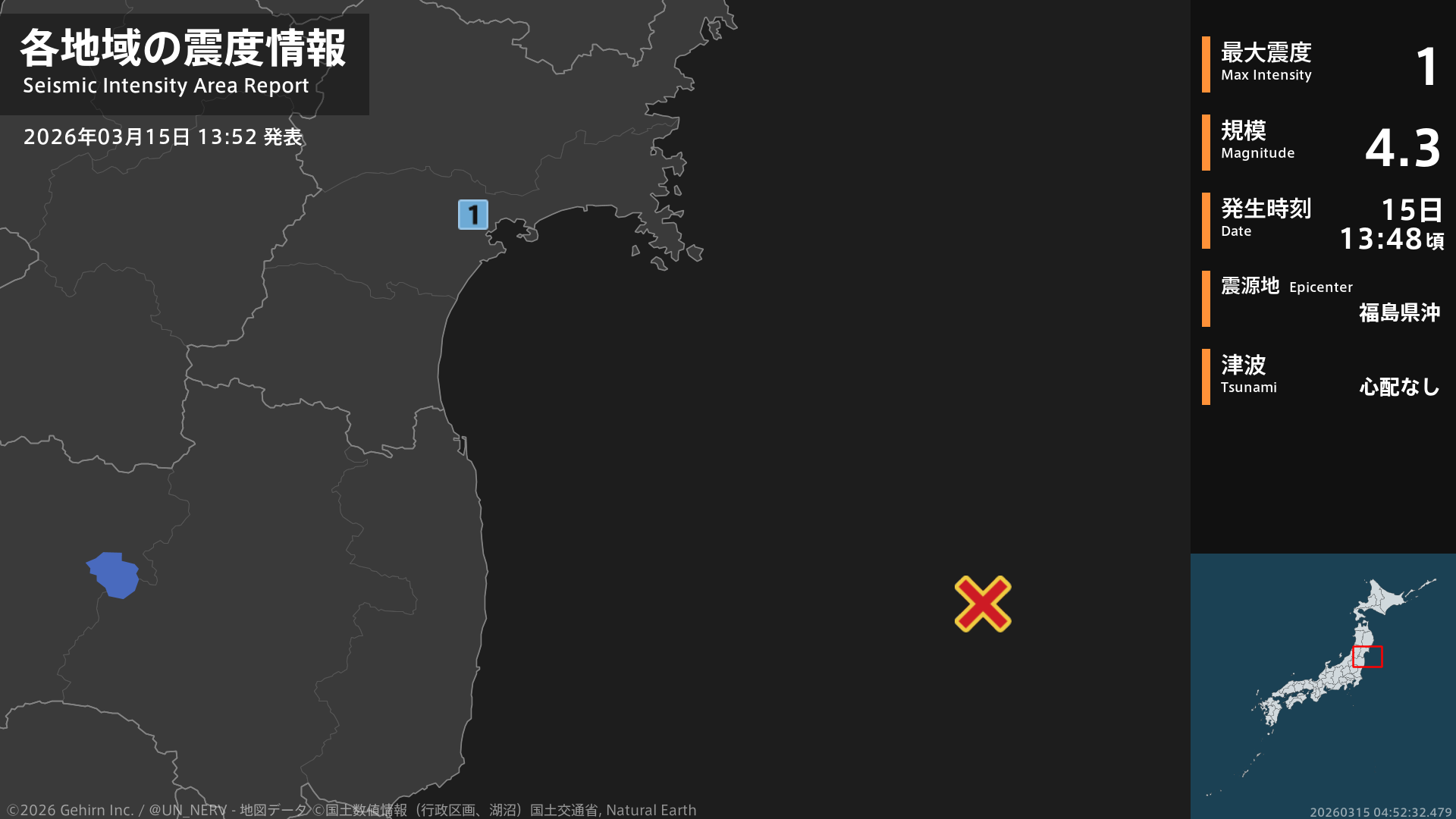 15時58分頃、長野県南部を震源とする地震がありました。震源の深さは約10km、地震の規模はM2.4、最大震度1を長野県で観測しています。この地震による津波の心配はありません。