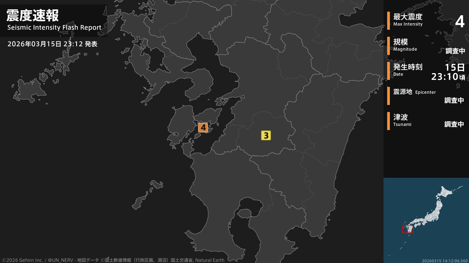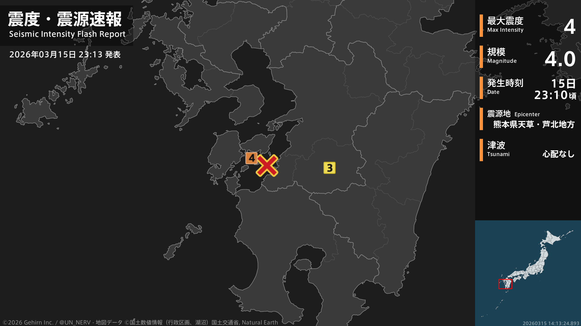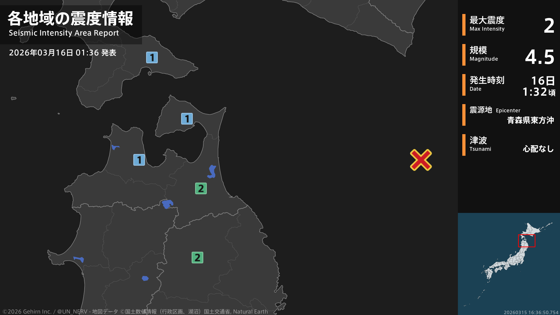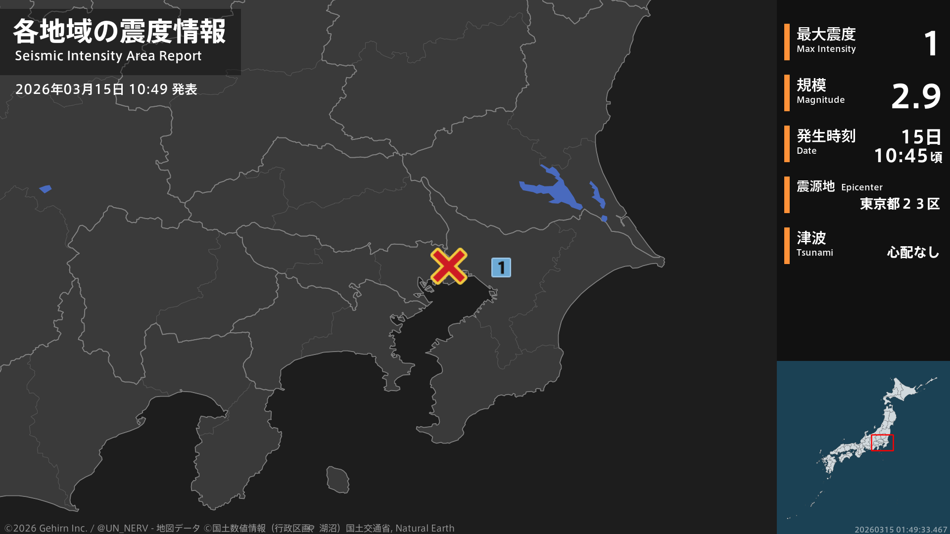 15時58分頃、長野県南部を震源とする地震がありました。震源の深さは約10km、地震の規模はM2.4、最大震度1を長野県で観測しています。この地震による津波の心配はありません。