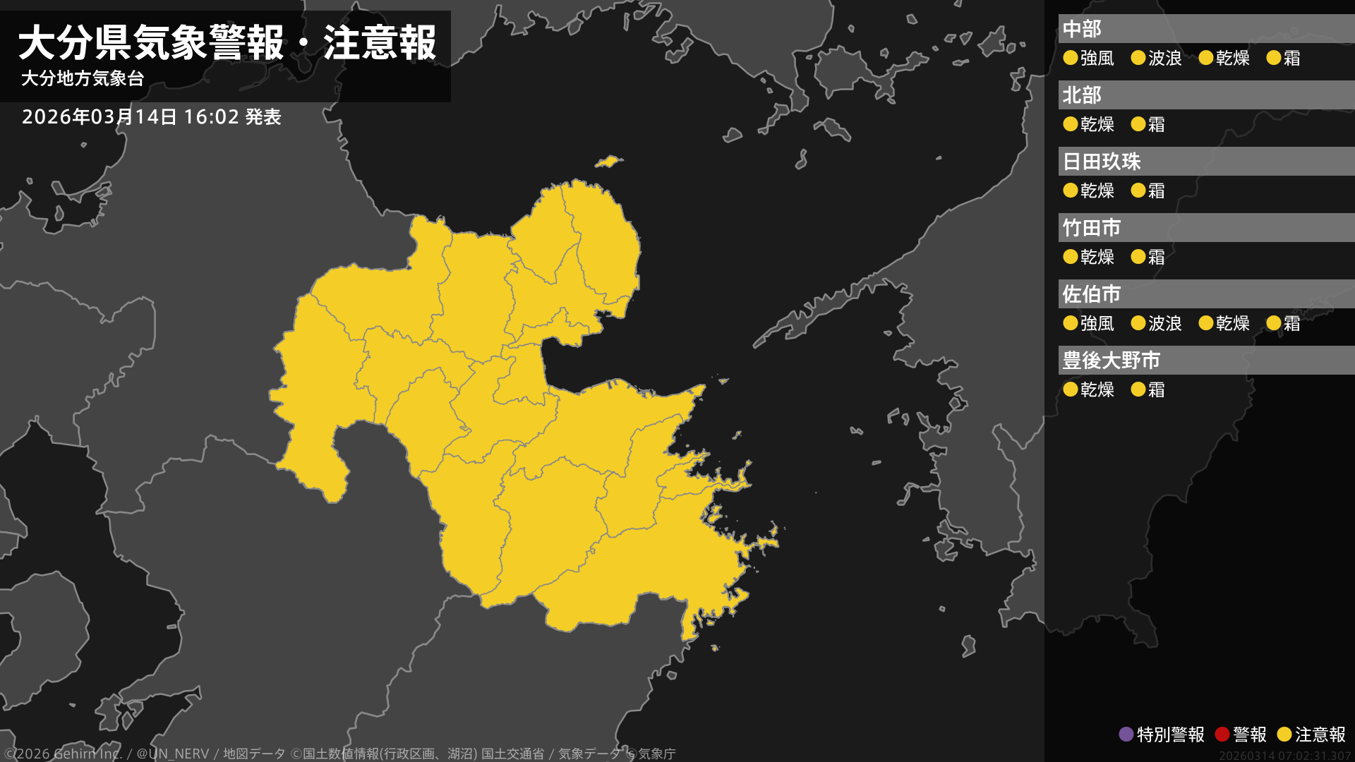 【大分県 気象警報・注意報 2026年03月14日 16:02】