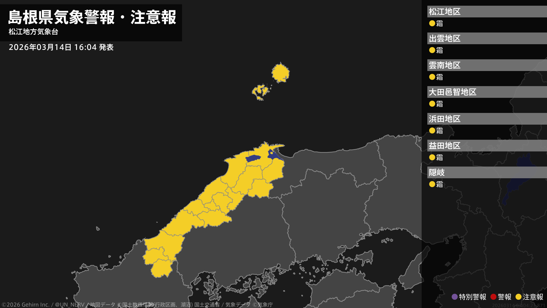 【島根県 気象警報・注意報 2026年03月14日 16:04】