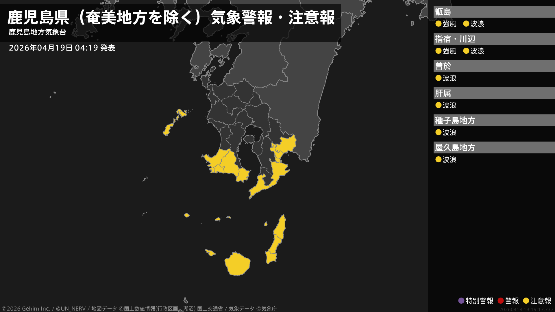 【鹿児島県(奄美地方を除く) 気象警報・注意報 2026年04月18日 04:09】薩摩地方では、強風に注意してください。薩摩、大隅、種子島・屋久島地方では、高波に注意してください。#気象警報注意報 #鹿児島県(奄美地方除く)