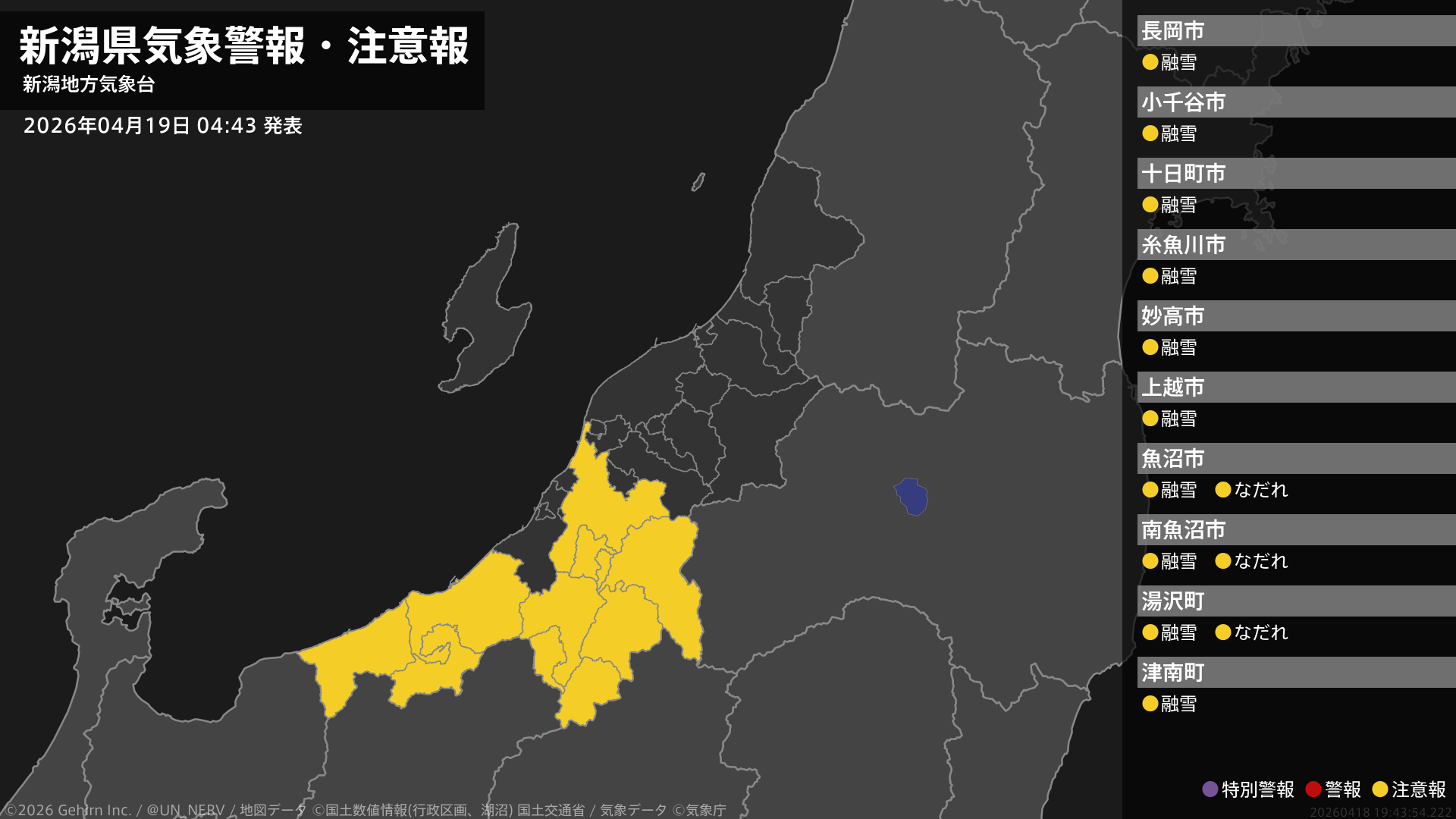 【新潟県 気象警報・注意報 2026年04月18日 04:26】中越、上越では、融雪による土砂災害に注意してください。中越では、なだれに注意してください。#気象警報注意報 #新潟県