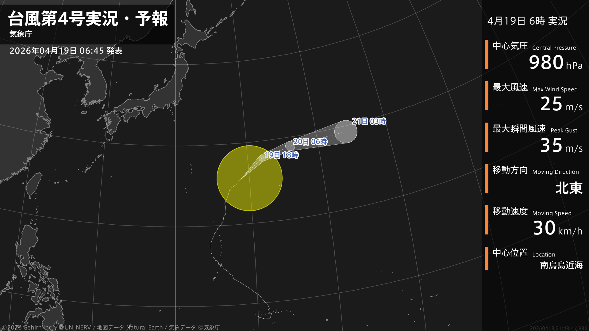【台風第4号実況・予報 2026年04月18日 06:42】大型で強い台風第4号(シンラコウ)は、小笠原近海を1時間に10キロの速さで北北東に進んでいます。#台風情報