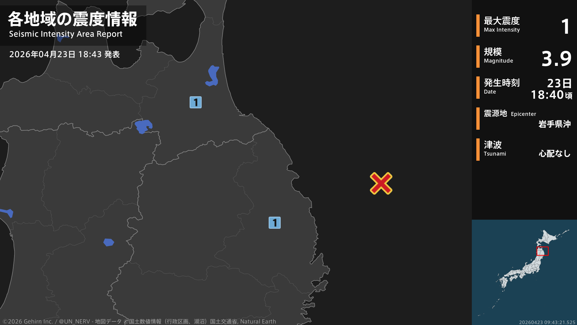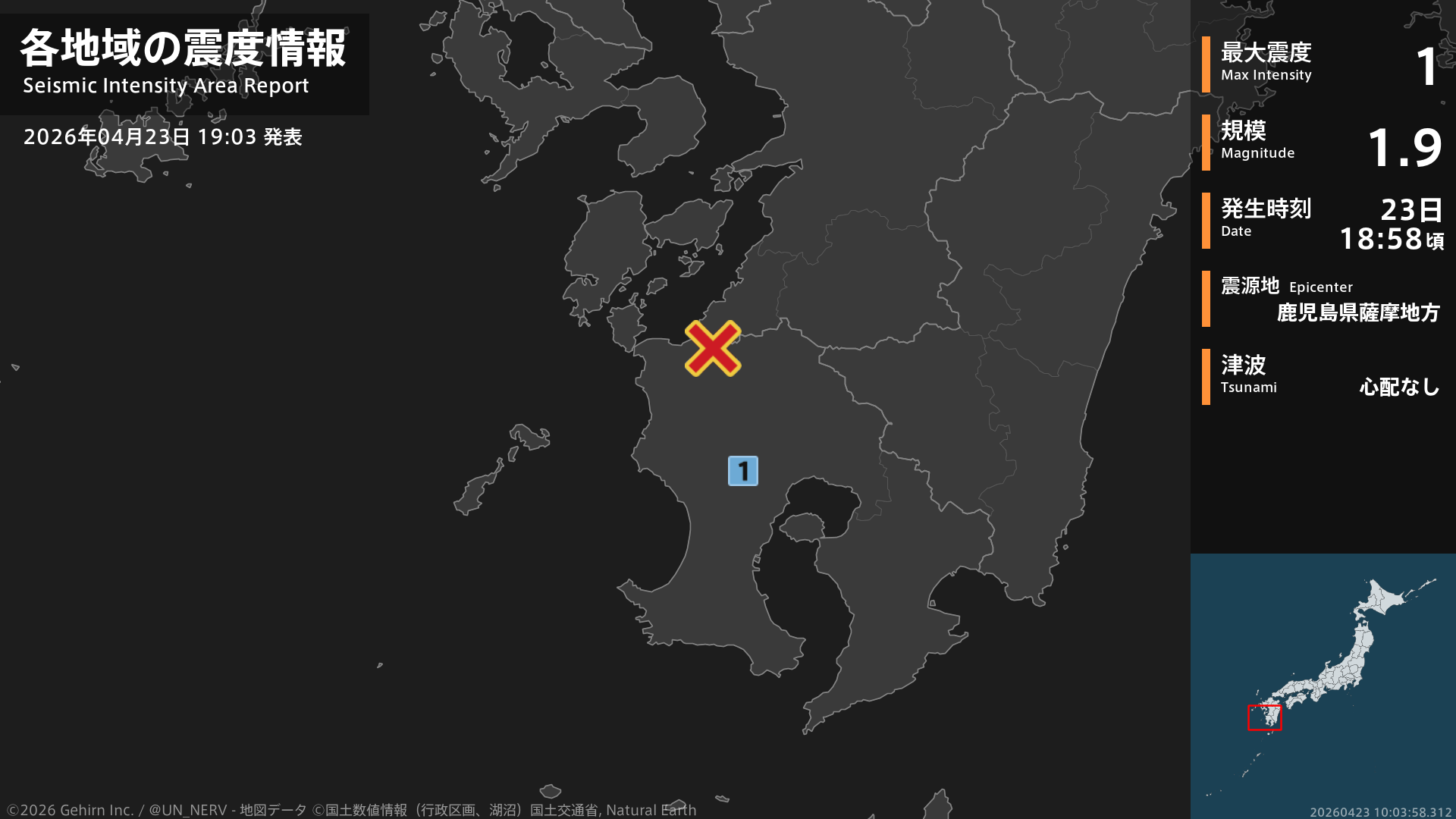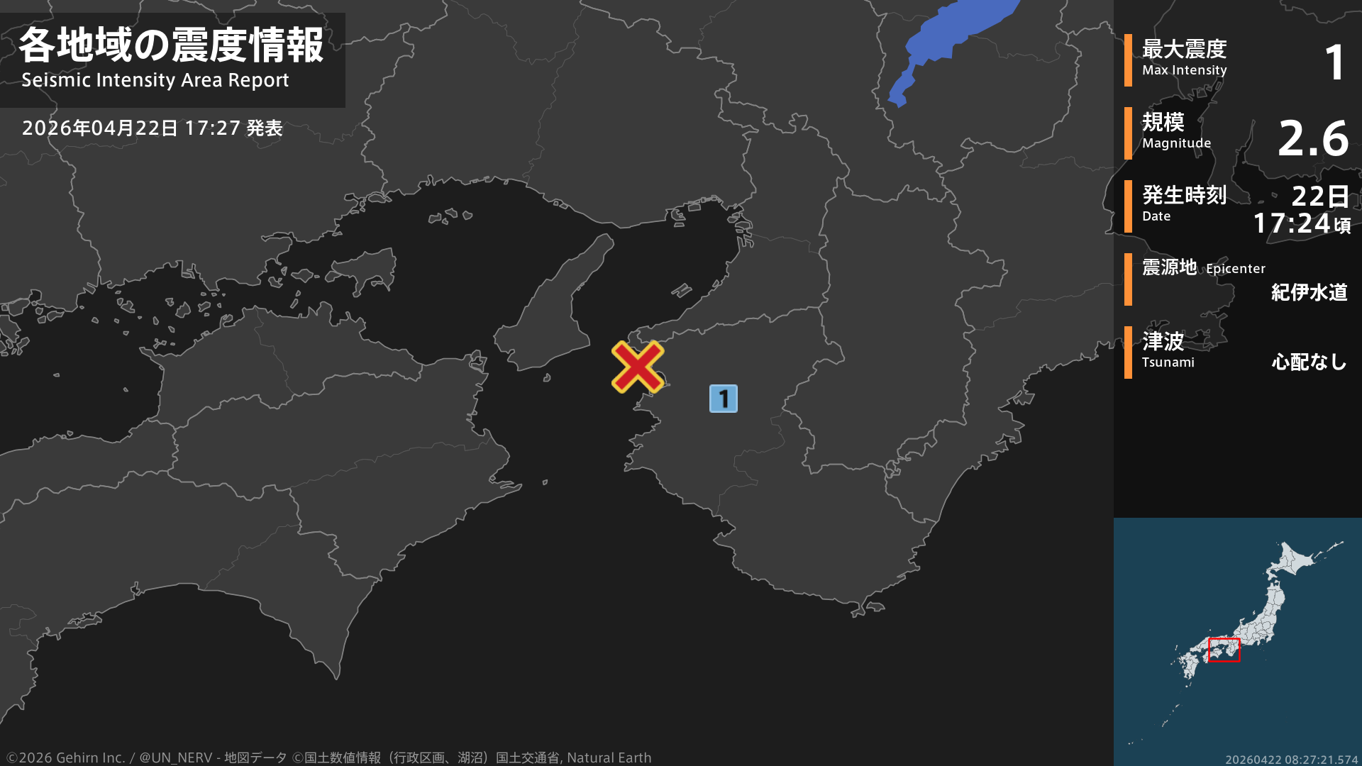 19時58分頃、石川県能登地方を震源とする地震がありました。震源の深さは約10km、地震の規模はM1.7、最大震度1を石川県で観測しています。この地震による津波の心配はありません。