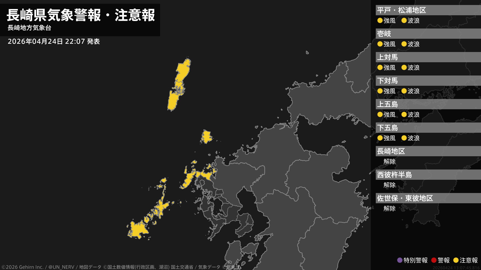 【長崎県 気象警報・注意報 2026年04月24日 22:07】壱岐・対馬、五島では25日明け方まで、北部では25日夕方まで、強風に注意してください。北部、壱岐・対馬、五島では、25日明け方まで高波に注意してください。#気象警報注意報 #長崎県