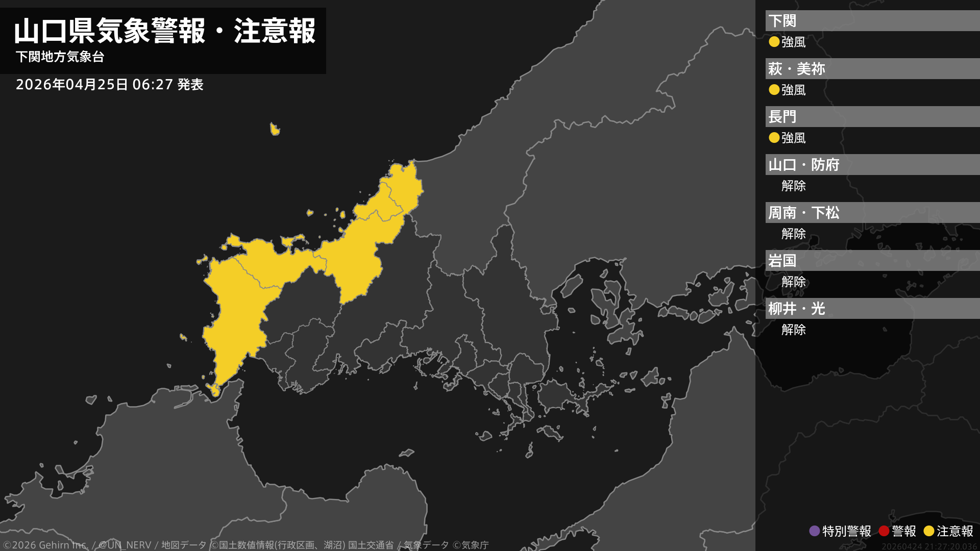【山口県 気象警報・注意報 2026年04月24日 20:49】東部では25日朝まで、西部、北部では25日夕方まで、強風に注意してください。中部、東部では、25日朝は霜に対する農作物の管理に注意してください。#気象警報注意報 #山口県