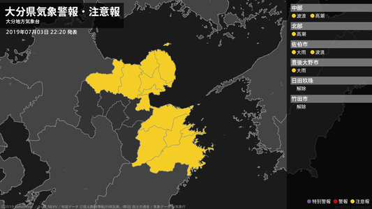 【大分県 気象警報(解除) 2019年07月03日 22:20】大分県に発表されていた気象警報はすべて解除されました。#気象警報 #大分県