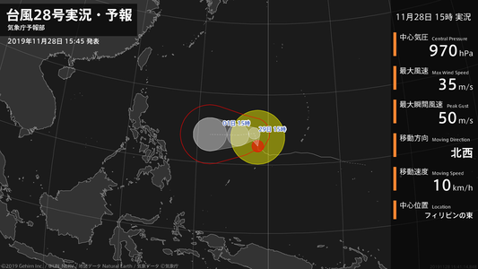 【台風28号実況・予報 2019年11月28日 15:41】強い台風28号(カンムリ)は、フィリピンの東を1時間に10キロの速さで北西に進んでいます。#台風情報