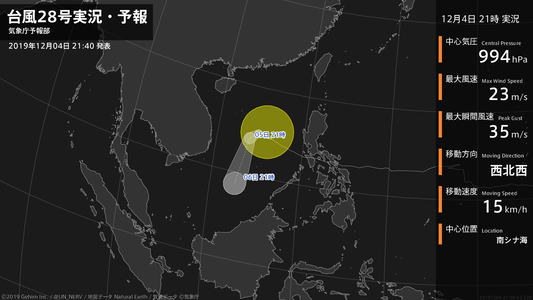 【台風28号実況・予報 2019年12月04日 21:36】台風28号(カンムリ)は、南シナ海を1時間に15キロの速さで西北西に進んでいます。#台風情報