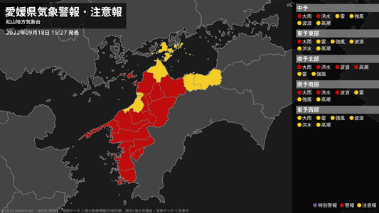 【愛媛県 気象警報 2022年09月18日 15:27】愛媛県では、土砂災害に警戒してください。南予では、低い土地の浸水や高波、高潮に警戒してください。中予、南予では、河川の増水に警戒してください。#気象警報 #気象警報注意報 #愛媛県