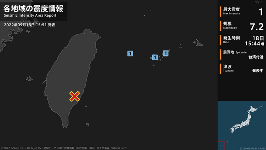 【地震情報 2022年9月18日】15時44分頃、台湾付近を震源とする地震がありました。震源の深さはごく浅い、地震の規模はM7.2、最大震度1を沖縄県で観測しています。津波注意報を発表中です。#地震 #沖縄県