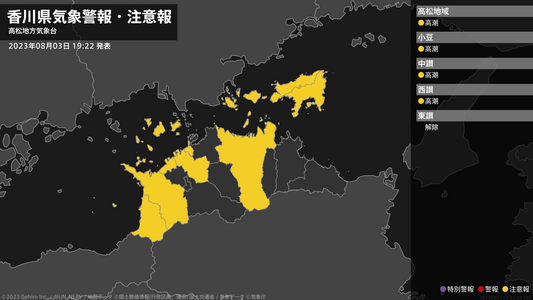 【香川県 気象警報・注意報 2023年08月03日 19:22】香川県では、4日未明は高潮に注意してください。#気象警報注意報 #香川県