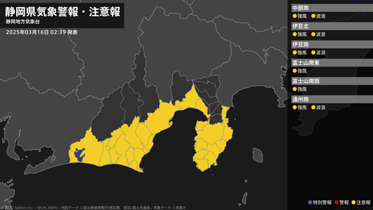 【静岡県 気象警報・注意報 2025年03月16日 02:39】静岡県では、強風に注意してください。中部、伊豆、西部では、高波に注意してください。#気象警報注意報 #静岡県
