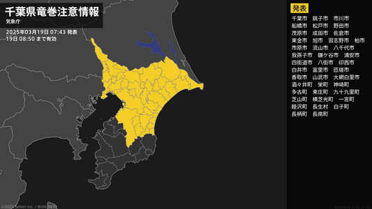 【千葉県 竜巻注意情報】千葉県は、竜巻などの激しい突風が発生しやすい気象状況になっています。頑丈な建物内に移動するなど安全確保に努めてください。この情報は19日08:50まで有効です。#竜巻注意情報 #千葉県