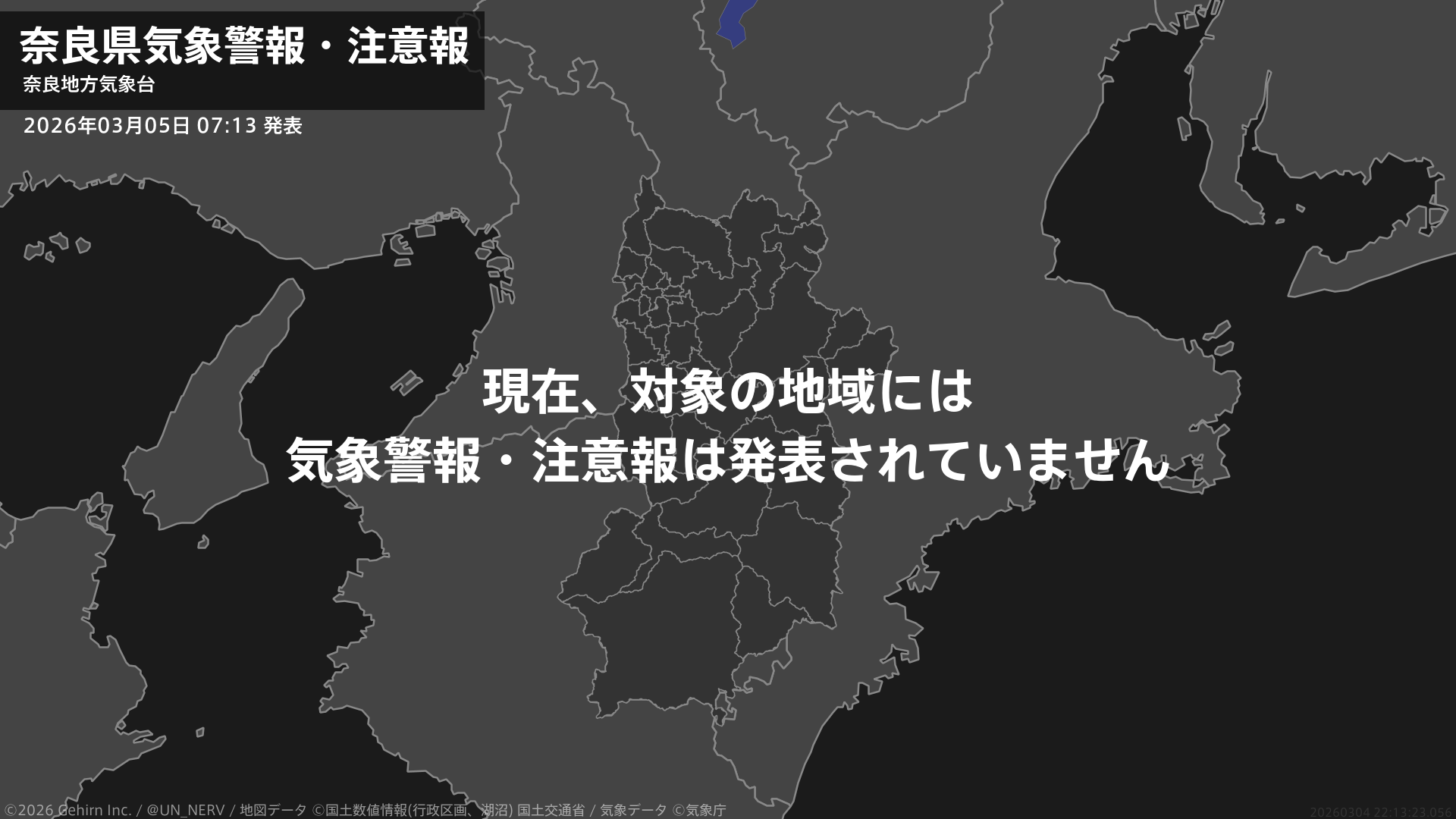 【奈良県 気象警報・注意報 2026年03月05日 07:13】注意報を解除します。#気象警報注意報 #奈良県