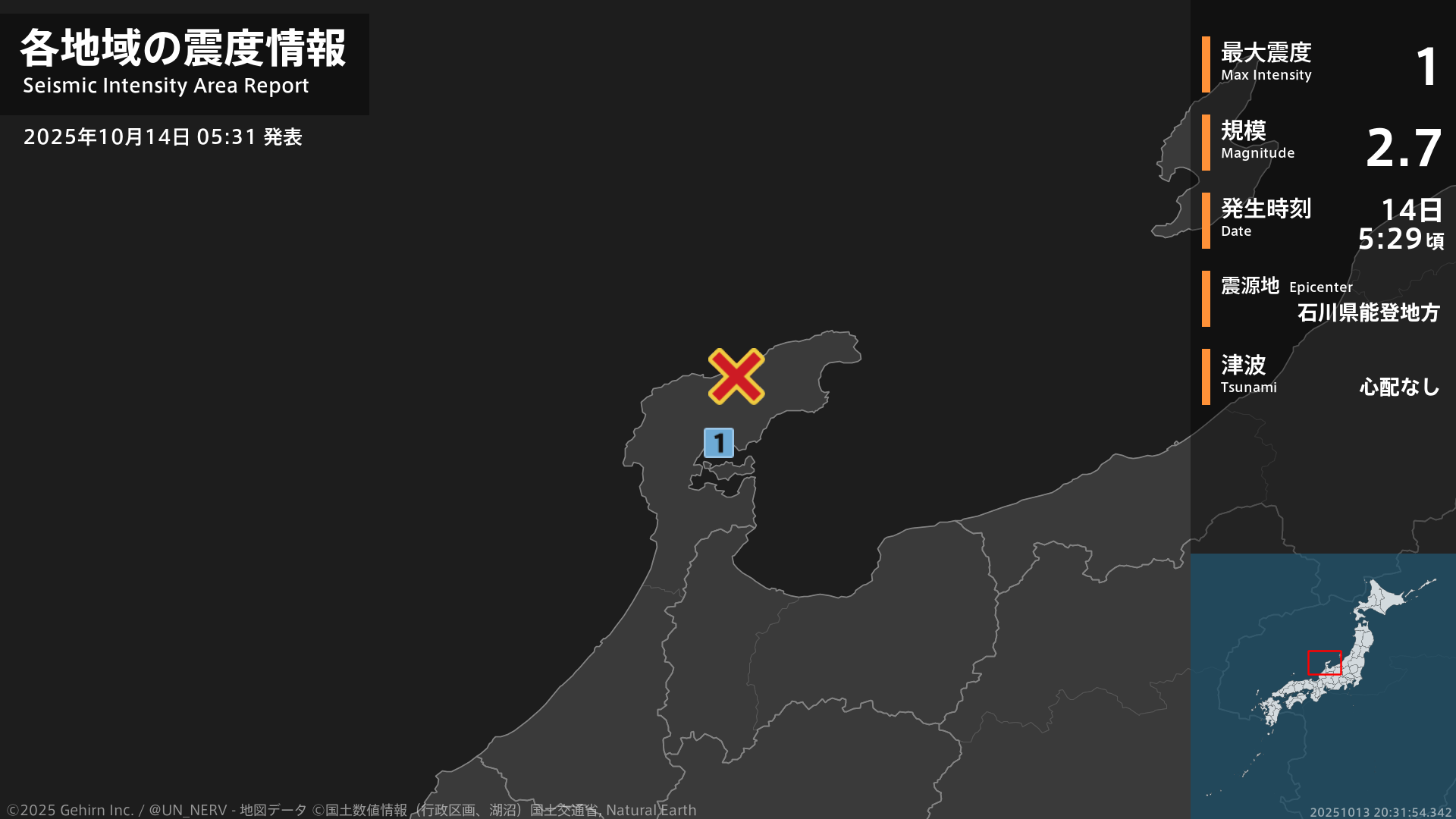 【地震情報 2025年10月14日】5時29分頃、石川県能登地方を震源とする地震がありました。震源の深さは約10km、地震の規模はM2.7、最大震度1を石川県で観測しています。この地震による津波の心配はありません。#地震 #石川県