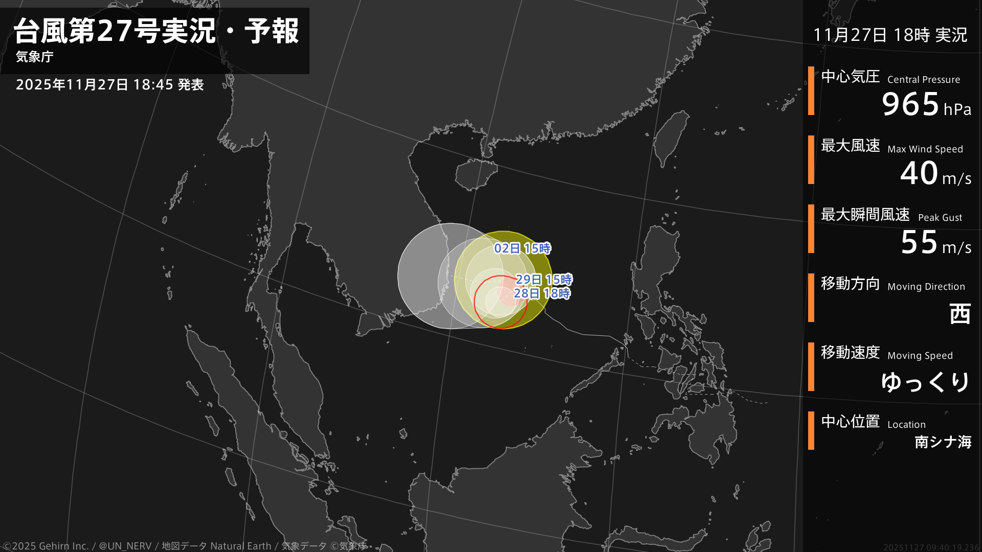 【台風第27号実況・予報 2025年11月27日 18:40】強い台風第27号(コト)は、南シナ海をゆっくりと西に進んでいます。#台風情報