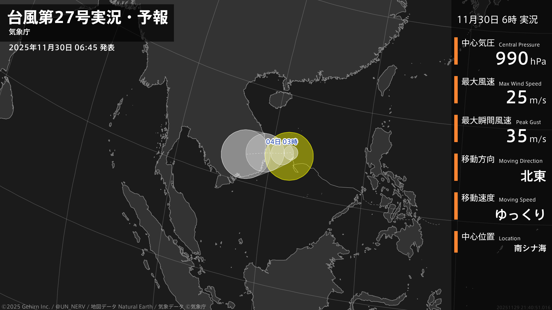 【台風第27号実況・予報 2025年11月30日 03:41】台風第27号(コト)は、南シナ海をゆっくりと北北東に進んでいます。#台風情報