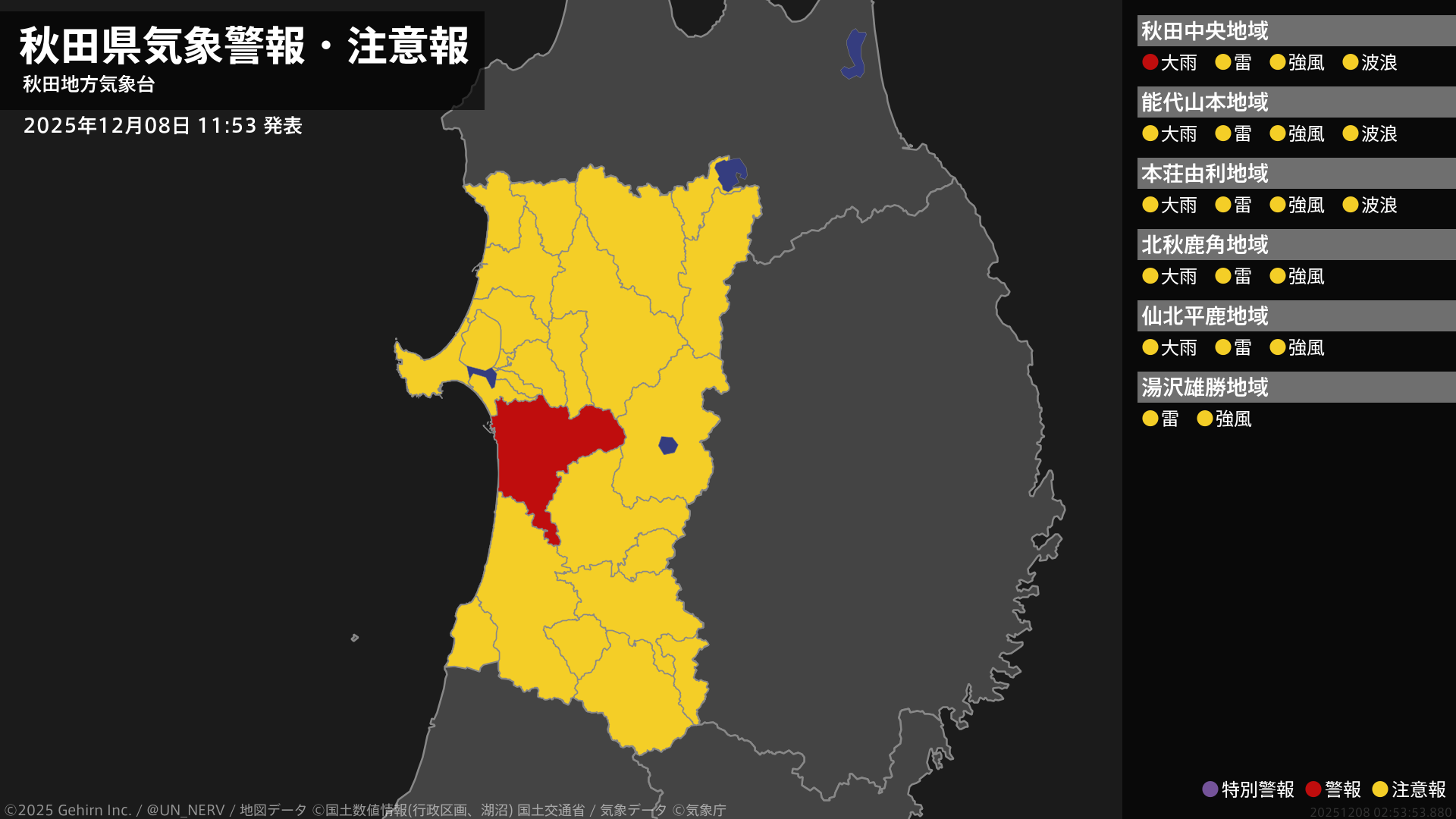 【秋田県 気象警報・注意報 2025年12月08日 11:53】沿岸では、8日夕方まで土砂災害に警戒してください。#気象警報注意報 #秋田県